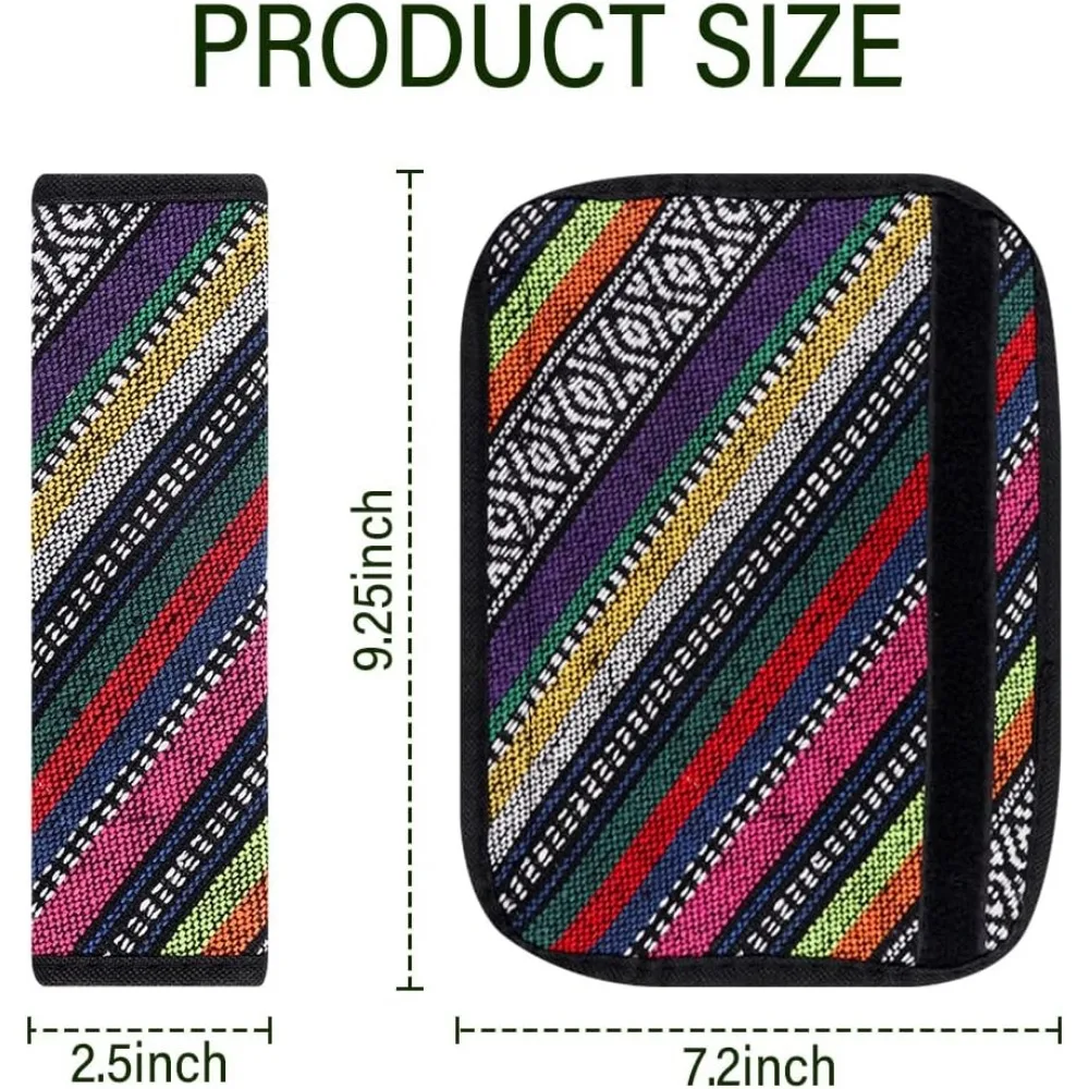 Transform your driving experience with this vibrant 2PCS Seat Belt Cover Pad set, designed to add a stylish and functional touch to your vehicle. The colorful woven patterns featuring deep blue, green, red, purple, and orange diagonal stripes not only provide shoulder protection but also elevate your car's aesthetic. Made from soft polyester fiber and sponge, these pads are breathable and slip-resistant, ensuring comfort on your journeys. With a size of 9.25 x 7.2″ when unfolded, they perfectly fit your seat belts, making every drive enjoyable. Create an inviting atmosphere in your car while relieving fatigue with these beautiful cushion pads.