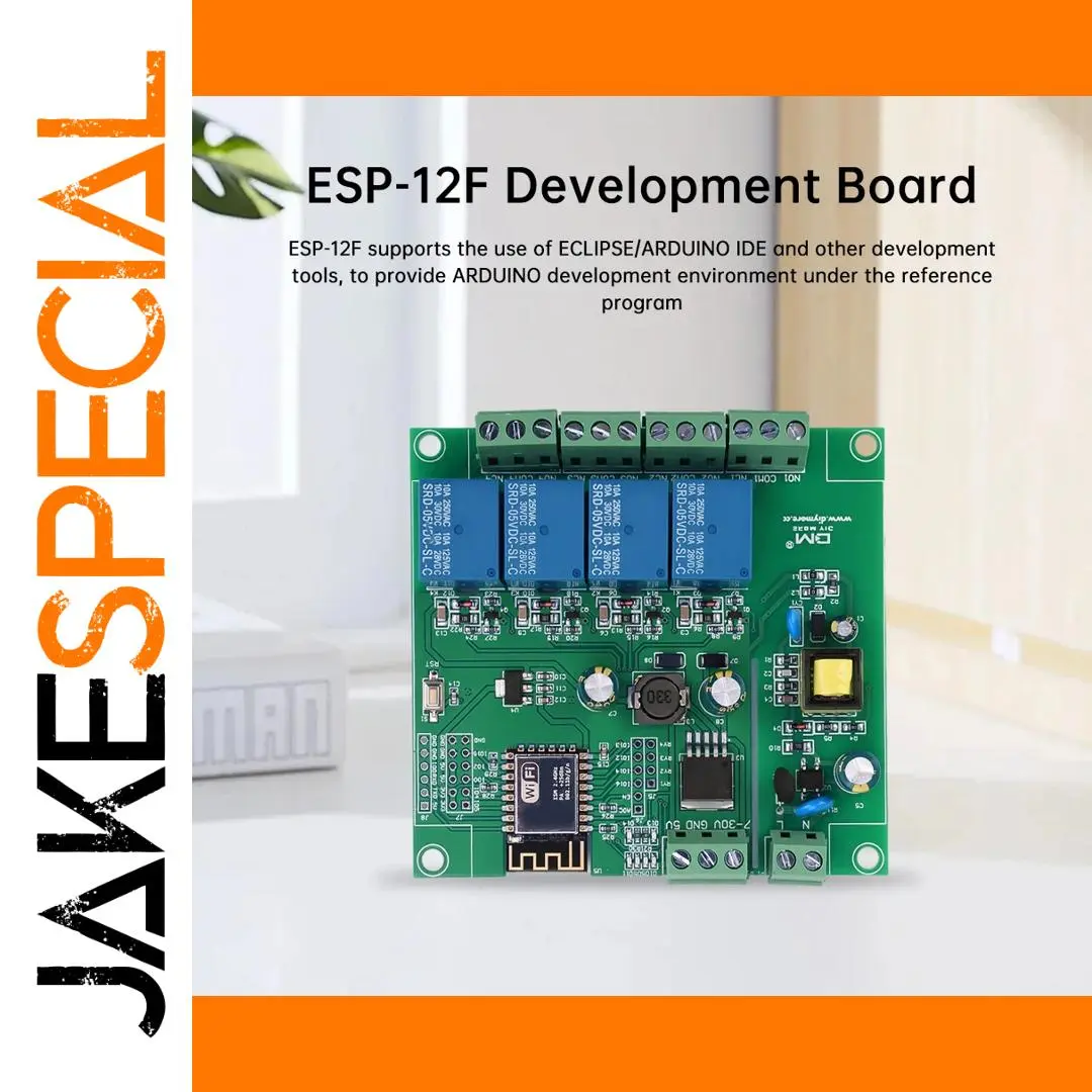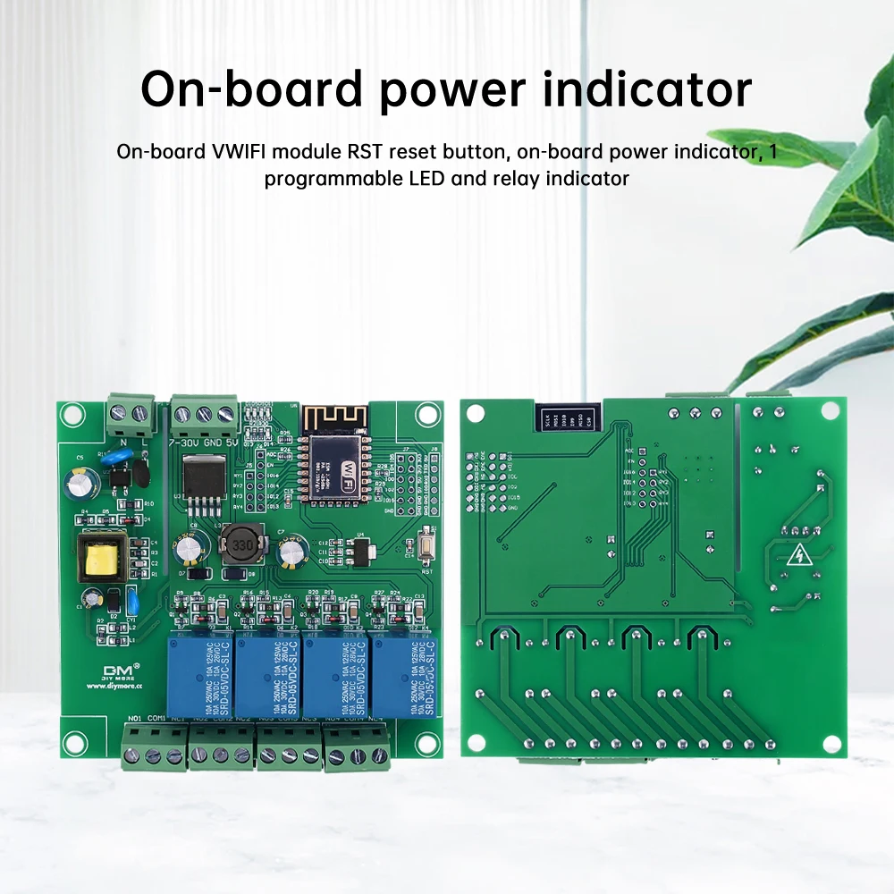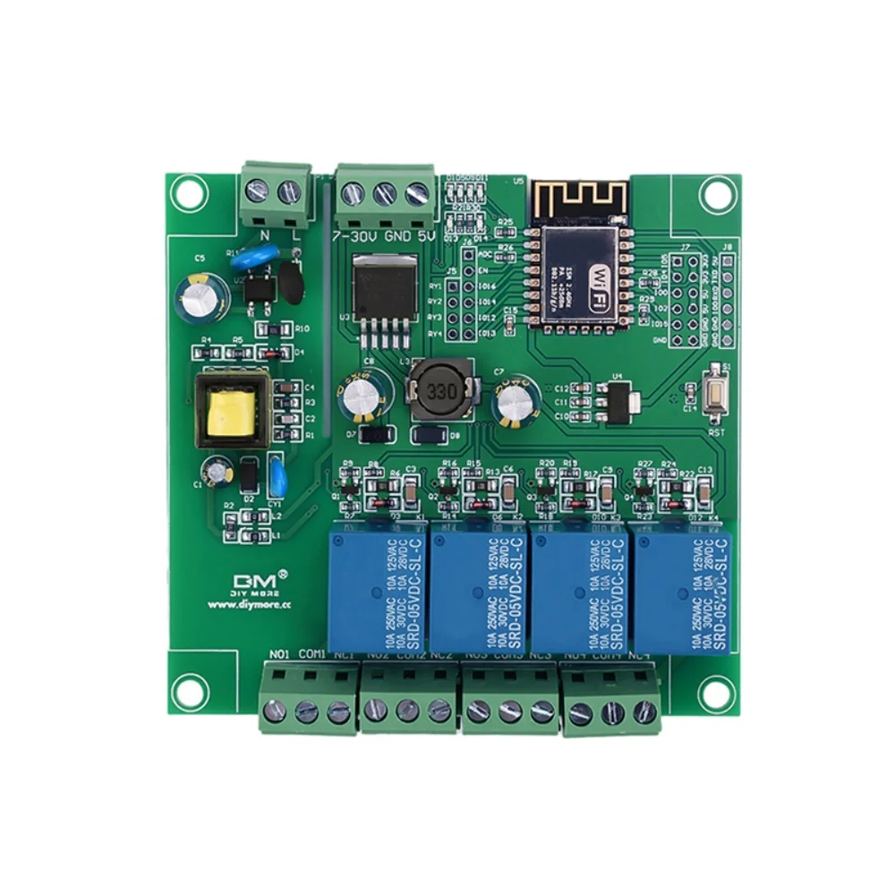 This 4-channel relay module features a vibrant green PCB housing four bright blue 5V relays, each capable of switching loads up to AC 250V or DC 30V, controlled via GPIO pins from the on-board ESP8266 ESP-12F WiFi module with 4MB FLASH memory. Powered by an integrated AC-DC switching power supply supporting input voltages of AC 90-250V or DC 7-30V, it includes a reset button, power indicator, programmable LED, and relay status indicators. The module offers convenient interface connections for programming (GND, RX, TX, 5V) and relay output terminals with NC, COM, and NO contacts, ensuring reliable high- and low-state switching for versatile automation applications.