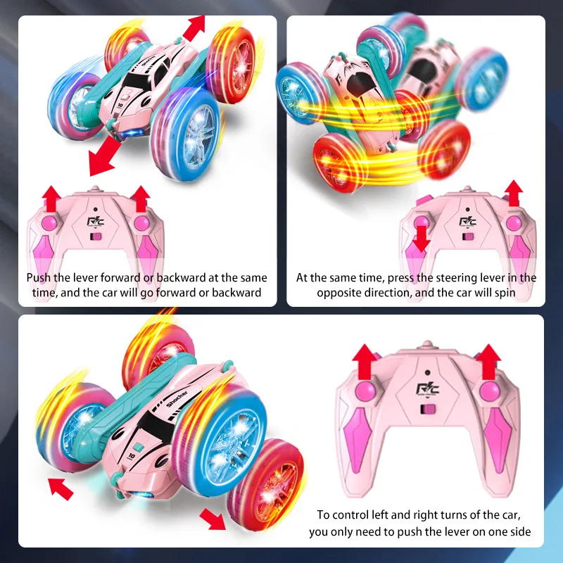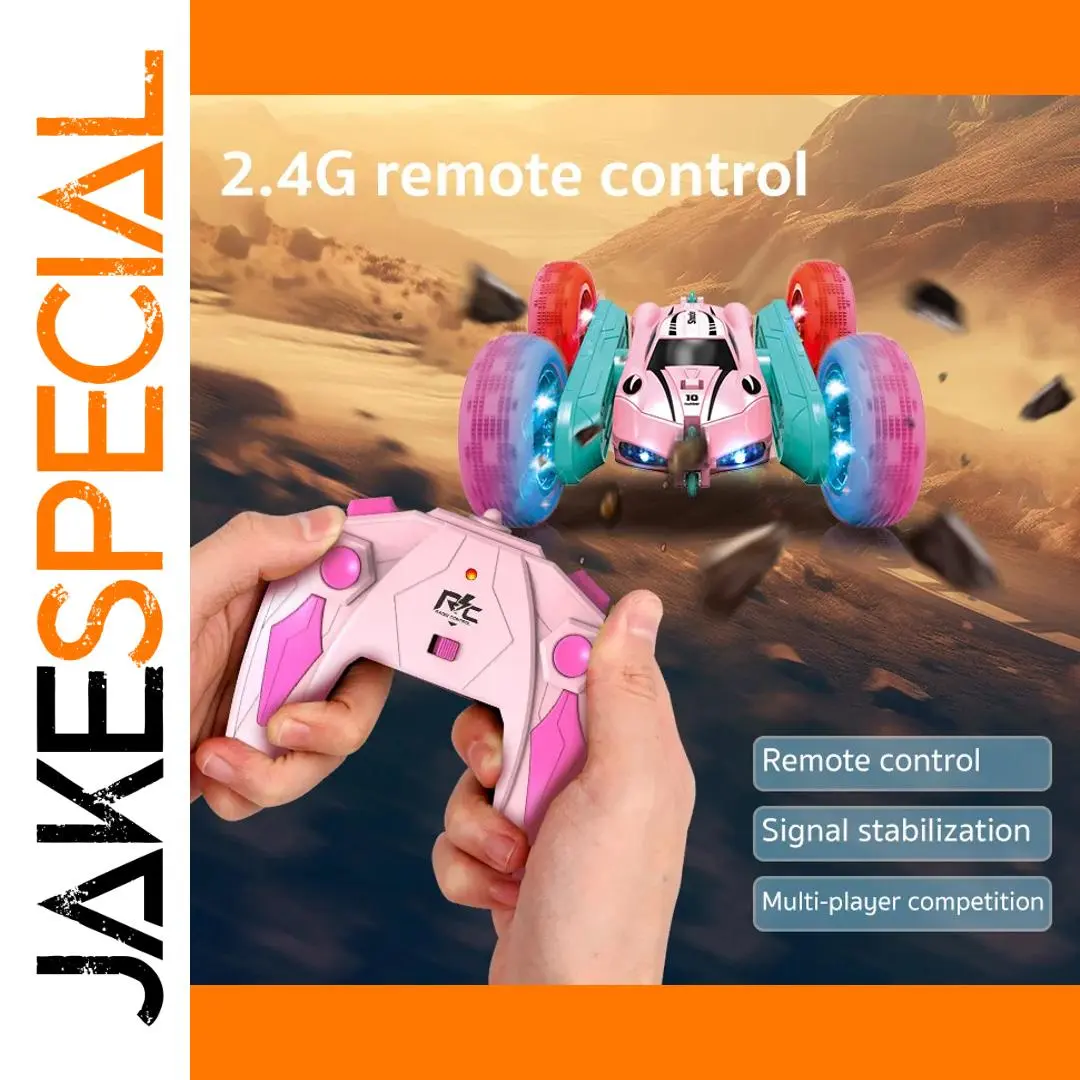 Imagine yourself holding this exciting four-wheel drive stunt car, ready to unleash hours of high-speed action. Its sleek and futuristic design, dominated by a bright pink color with turquoise accents, creates an eye-catching appearance that stands out in any environment. The vehicle’s double-sided feature allows for seamless flipping and stunt performance, bringing an element of thrill to every play session. Its large, textured pink tires glow with blue LED lights, adding a cool visual effect in darker surroundings. The car responds instantly to the 2.4 GHz remote control, supporting multiple users without interference. Whether racing across the desert landscape or performing impressive stunts, this vehicle makes every moment energetic and unforgettable.