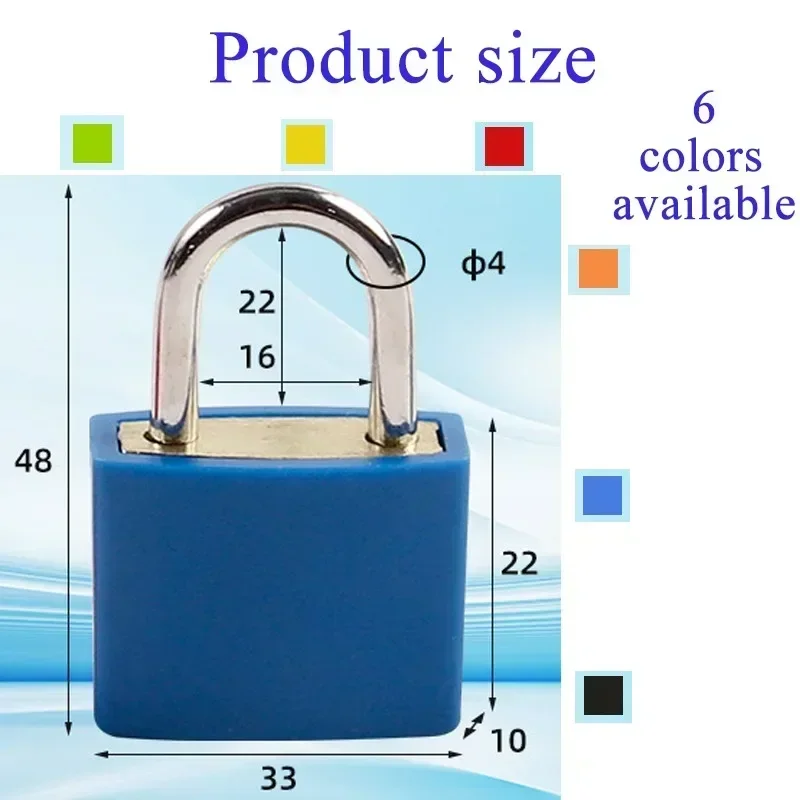 Secure your belongings with this set of 50 vibrant keyed padlocks, each measuring 33 x 48 x 10 mm and crafted from durable zinc alloy with steel shackles. The epoxy plastic shells come in six eye-catching colors—black, blue, green, orange, red, and yellow—helping you easily identify and manage your items. Equipped with two unique matching keys per lock, they offer rustproof, corrosion-resistant security for suitcases, backpacks, boxes, drawers, lockers, trunks, and more. Lightweight and reliable, these locks are perfect for travel, home, school, or work, combining practicality with bright, playful aesthetics for added peace of mind.