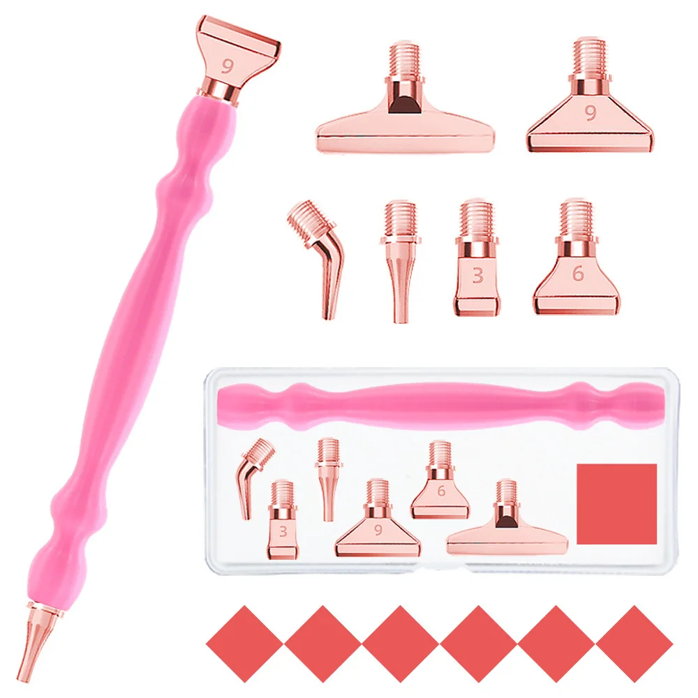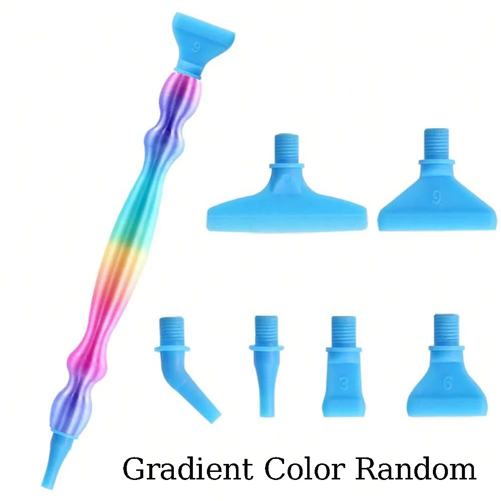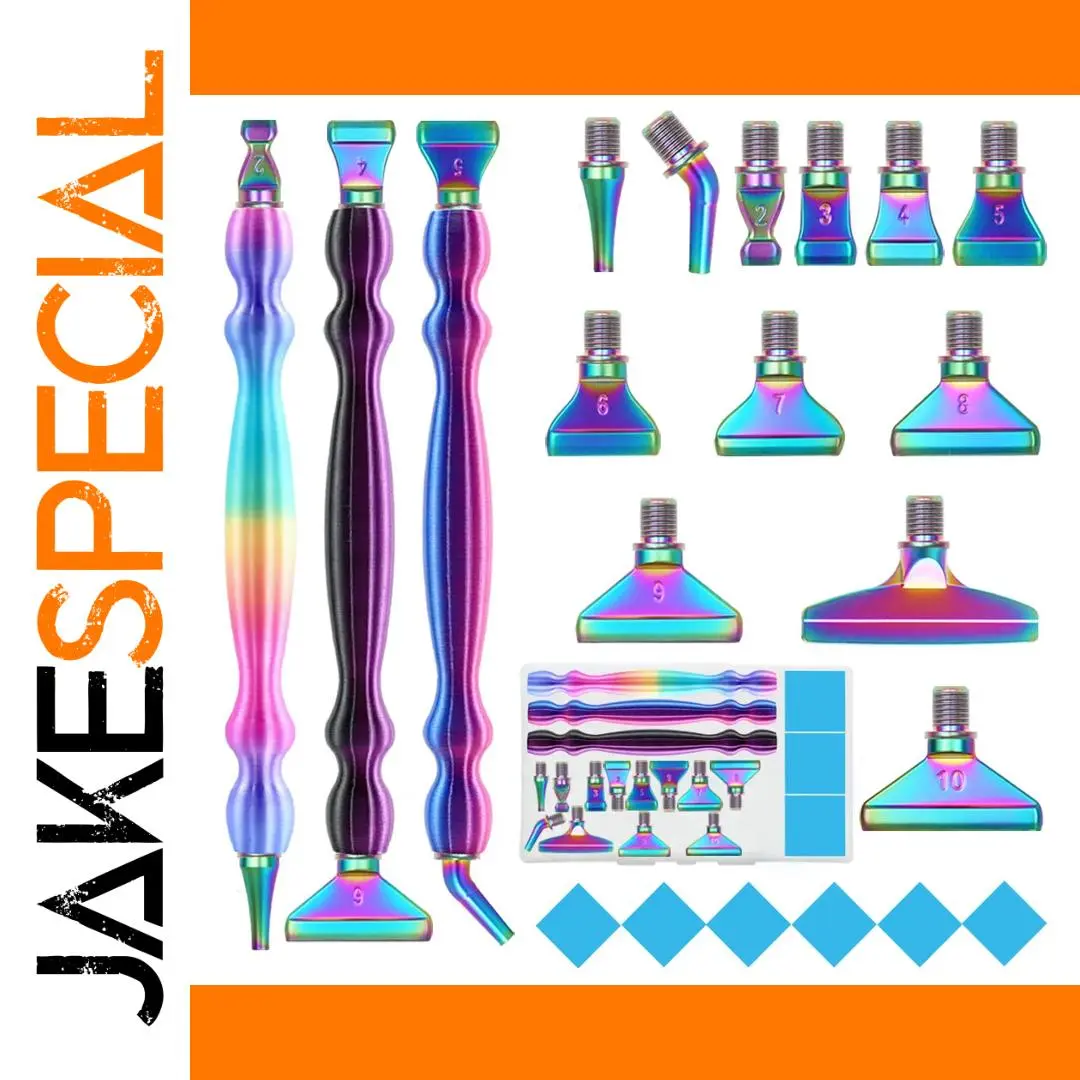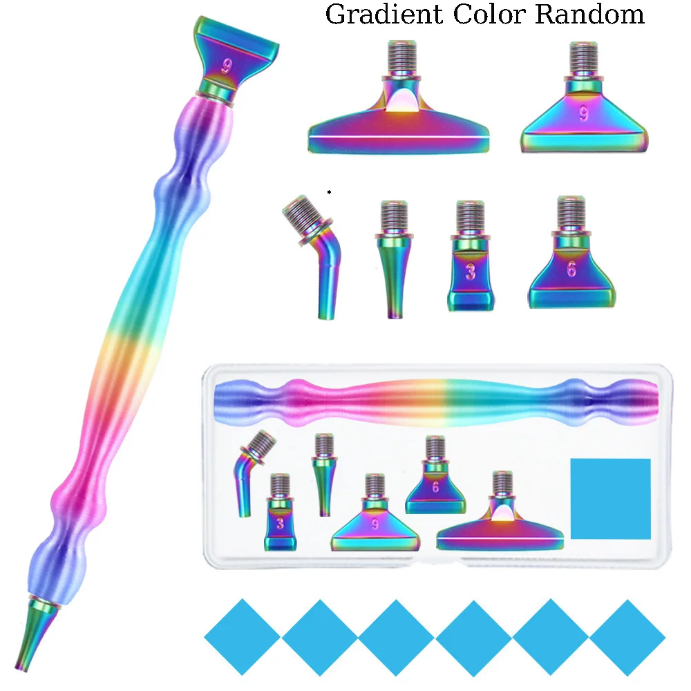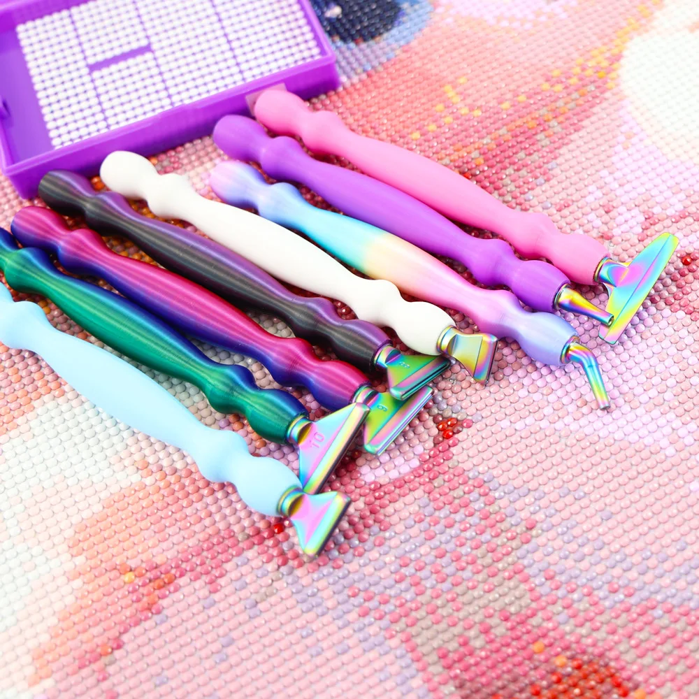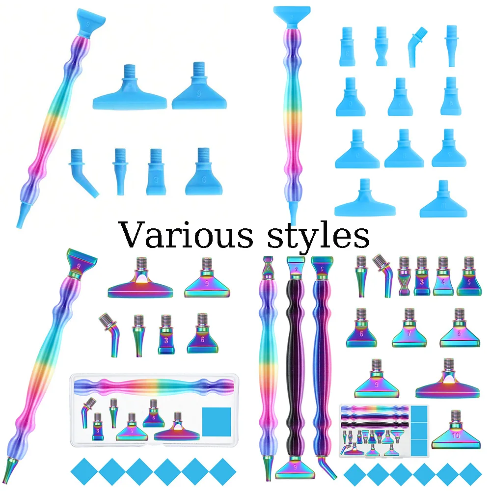 Enhance your diamond painting experience with this versatile 5D resin diamond painting pen set featuring interchangeable metal and plastic heads with 6 or 12 tips, compatible with full or partial themed projects. The pens are crafted with a sleek, iridescent finish in vibrant colors like green, orange, pink, and purple, and include acrylic square, round, and special-shaped tips for precise diamond placement. Designed for detailed craft work, these pens support various models such as 3Pen A, 3Pen B, and color-specific tips. Each pen features ergonomic, wavy handles for comfortable use, making your DIY art projects more enjoyable and professional-looking.