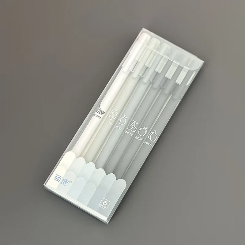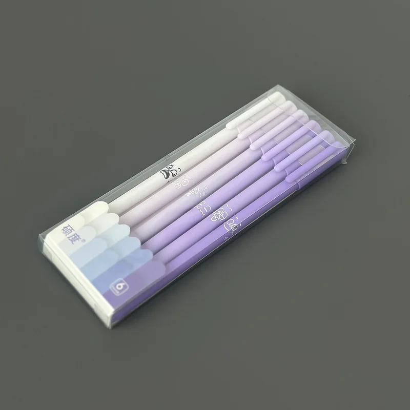 Prepare to elevate your writing experience with this set of six sleek, colorful gel pens. Designed with a modern, minimalist aesthetic, each pen features a smooth, glossy plastic body in vibrant hues including coffee, colorful, green, grey, orange, and purple. The slim, cylindrical shape ensures a comfortable grip, making it ideal for daily use at school or in the office. With a consistent 0.5mm black gel ink tip, these pens deliver precise, smooth lines every time. Their transparent caps and matching barrels add a cheerful and energetic touch, encouraging confident, expressive handwriting. Whether you're signing documents or jotting notes, these pens provide reliability and style in every stroke, transforming ordinary writing tasks into an enjoyable creative activity.