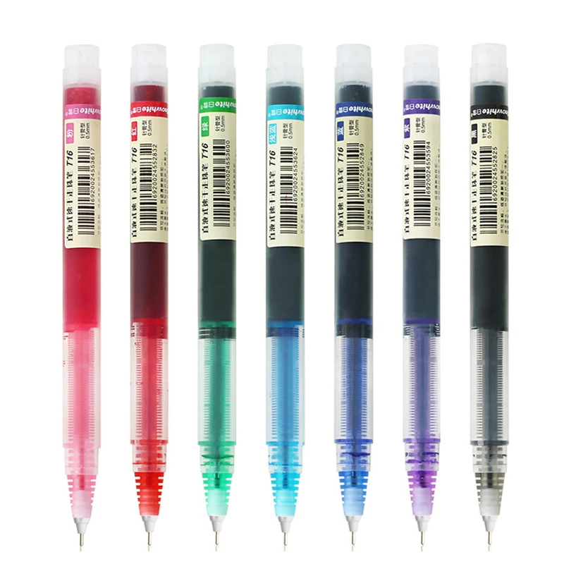 Enhance your writing experience with this set of seven colorful gel ink pens, perfect for office, school, or personal use. Each pen features a sleek, modern design made from durable plastic, ensuring comfortable handling. The transparent sections near the tips showcase the vivid ink colors, including bright blue, darker blue, purple, green, orange, pink, and red, allowing you to quickly identify your desired color. Equipped with a precise 0.5mm needle tip, these pens deliver smooth, accurate lines every time. The quick-drying, non-erasable gel ink is ideal for detailed note-taking, art, or professional documents. Their vibrant colors inspire creativity and organization, making them essential tools for any stationery collection or workspace.