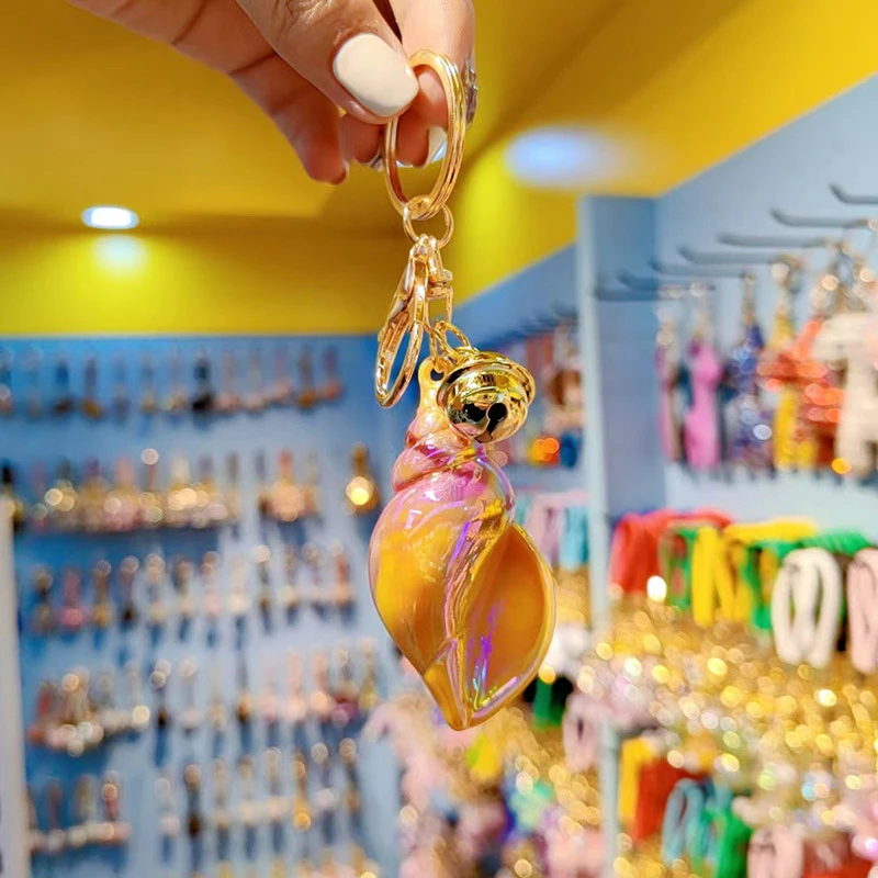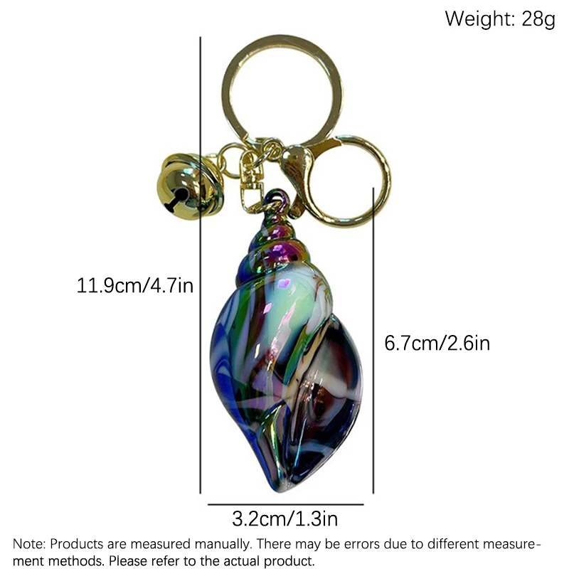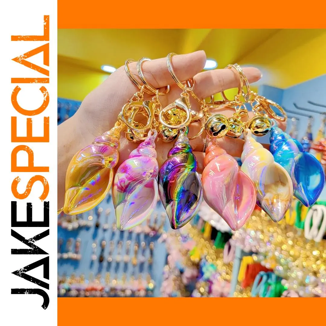 Enhance your everyday accessories with this eye-catching acrylic conch shell keyring, approximately 12 cm long. Its vivid, iridescent finish reflects pink, purple, blue, yellow, and black hues that shift beautifully in light. Designed with a spiral, elongated shell shape and glossy surface, it captures a lively beach-inspired aesthetic. Some variants feature small metallic bells or embellishments, adding playful detail. The keyring includes a durable O-shaped buckle for easy attachment to bags, keys, or zippers, making it versatile and perfect for daily use. Its unisex style and colorful design make it an ideal accessory to brighten your look or gift to a loved one during festive seasons, especially around New Year celebrations, evoking warmth and joyful memories.