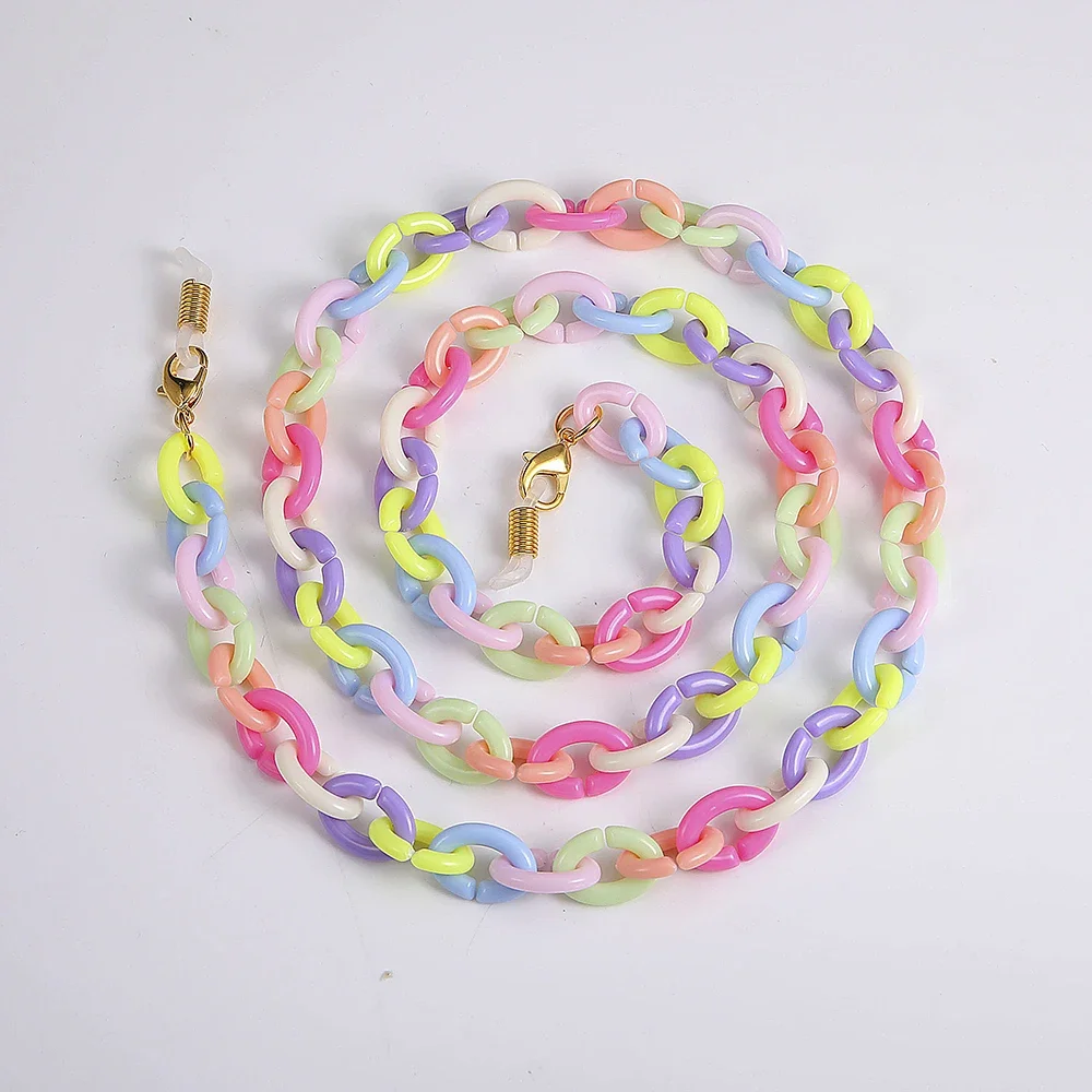 - The chain features vibrant, multicolored acrylic oval links with a smooth, glossy surface, creating a lively and playful aesthetic suitable for casual, romantic, or trendy outfits.