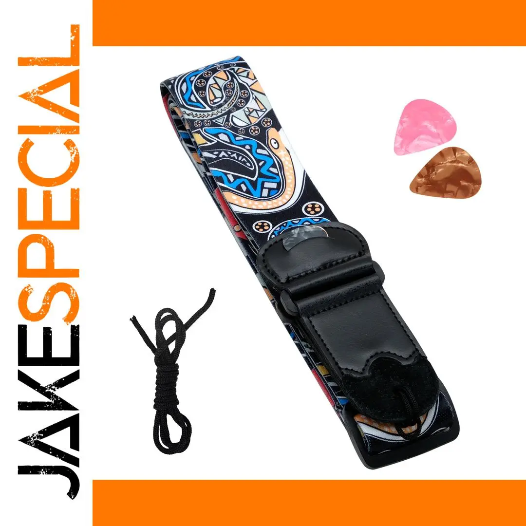 This premium adjustable guitar strap features a striking black background adorned with vibrant patterns including colorful snakes and geometric shapes in blue, orange, and red. It’s designed for musicians who seek both functionality and style. With an adjustable length ranging from 94 to 158 cm and a width of 6.5 cm, this strap is perfect for any playing style. Both comfortable and durable, it includes a hidden pocket for your guitar picks and a secure locking mechanism to keep your instrument safe. Imagine the confidence you’ll feel on stage with this eye-catching strap that enhances your performance and showcases your unique style!