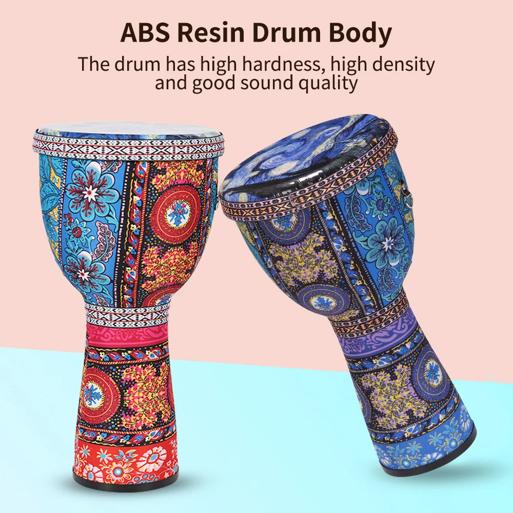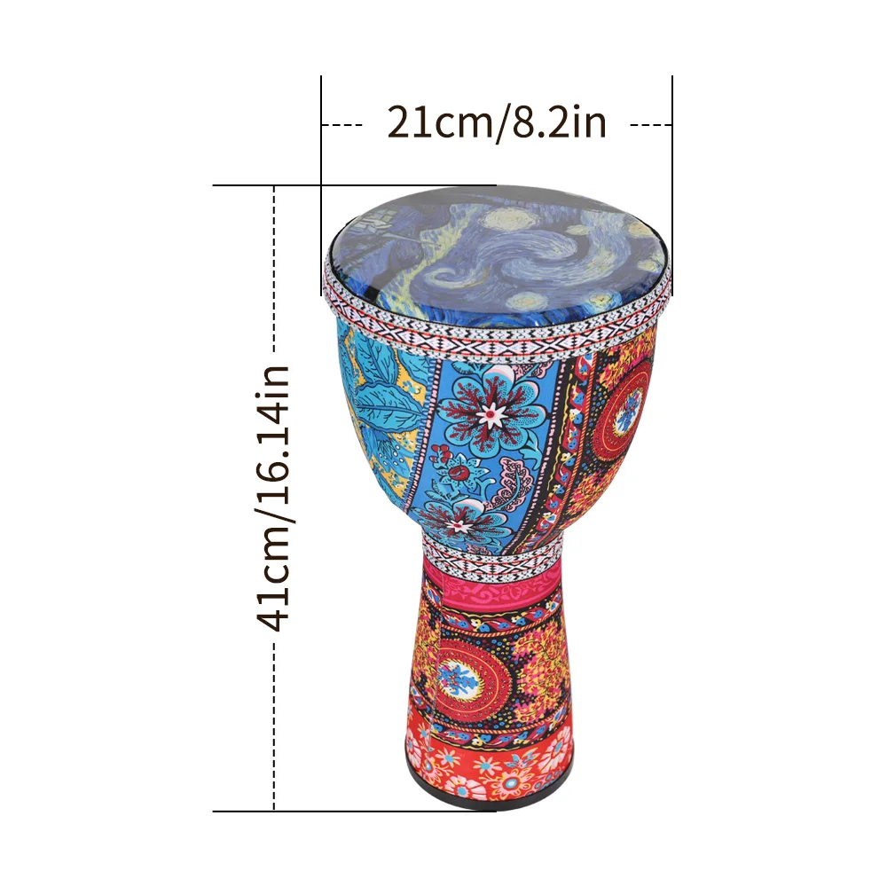 Imagine adding vibrancy and rhythm to your musical space with this captivating portable African hand drum. Crafted from lightweight PVC and ABS, it measures approximately 21 cm in diameter and 41 cm in height, making it perfect for on-the-go percussion enthusiasts. The drum's body is adorned with intricate, lively patterns featuring floral motifs, geometric shapes, and swirling designs, painted in bright shades of blue, red, pink, yellow, and black. Its glossy surface enhances the vividness of the artwork, giving it a polished, artistic appearance. Whether used for performances, decor, or personal practice, this piece elevates any environment with its cultural richness and visual appeal. Easy to carry and designed for durability, it becomes your ideal musical companion.