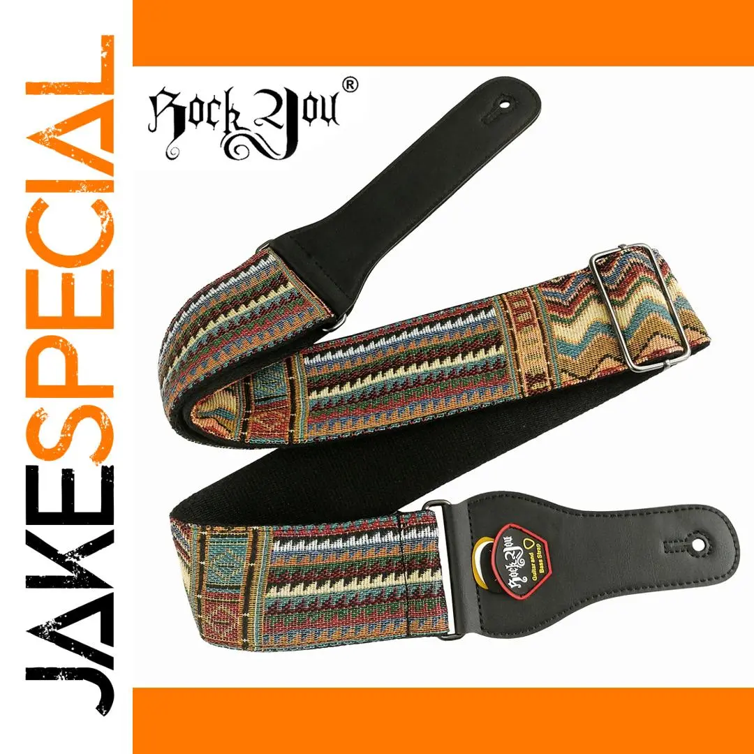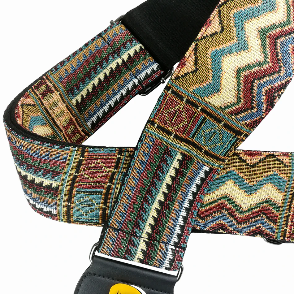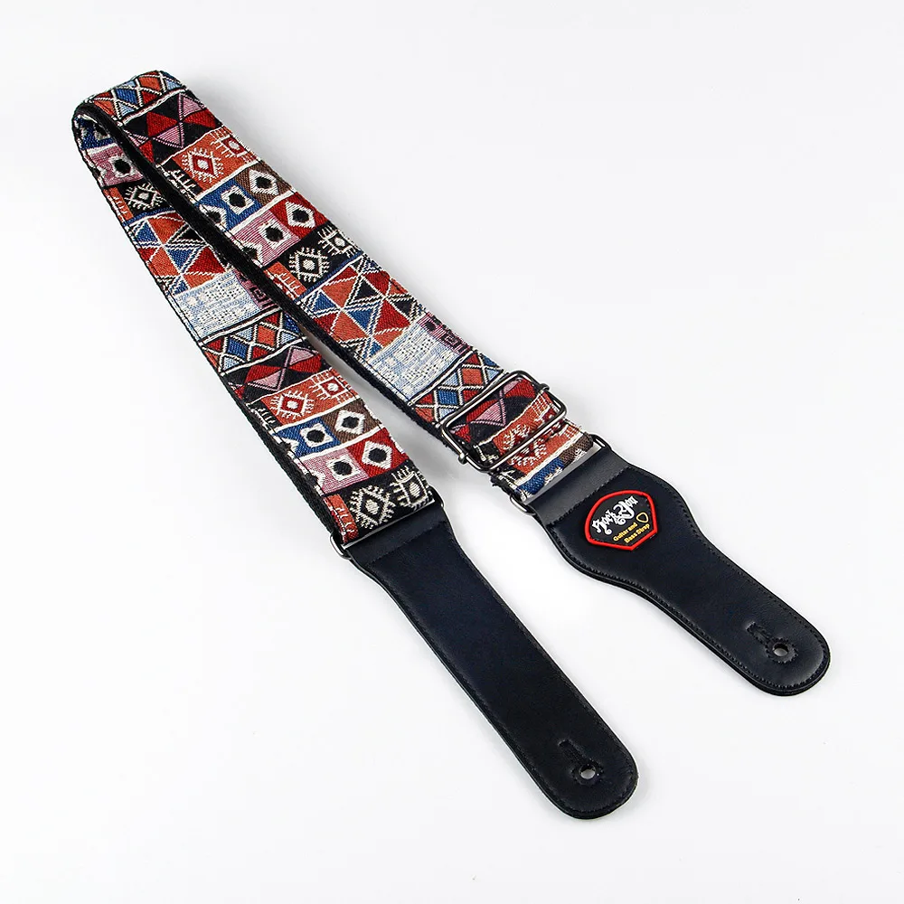 Imagine yourself confidently playing your favorite guitar, surrounded by the stunning, colorful patterns of this high-quality strap. Crafted with vibrant, multicolored woven textile featuring intricate geometric and zigzag designs, it instantly adds personality to your instrument. The strap’s bold hues of red, orange, yellow, green, blue, black, and beige create a lively, eye-catching look. The wide 6.2 cm (2.4″) body offers comfort and a striking visual presence. Reinforced with solid genuine black leather ends for durability, and featuring a shiny stainless steel buckle for easy length adjustment, this strap blends style with strength. Perfect for showcasing your unique musical personality at gigs or in practice sessions.