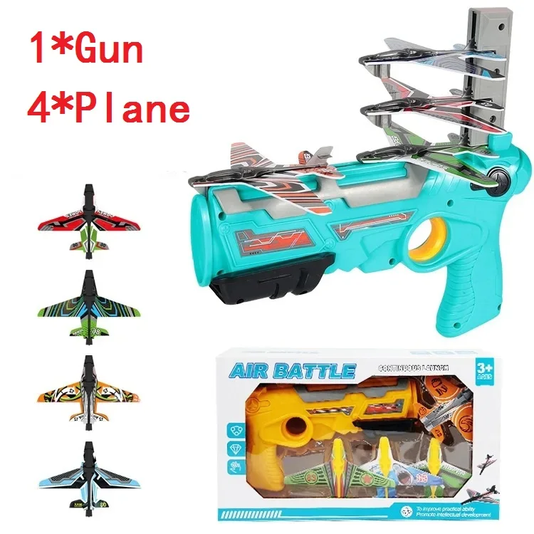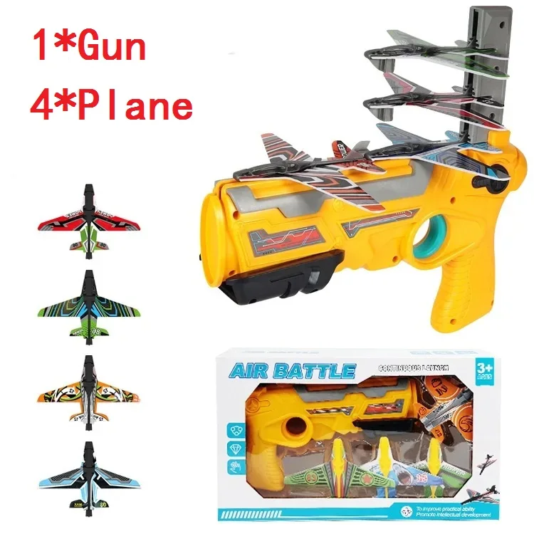 Experience the thrill of outdoor action with this colorful airplane launcher toy, perfect for engaging play. Crafted from durable plastic, it measures 25x15x8 cm, making it comfortable to hold and operate. Its sleek, modern pistol-like design features textured grips and streamlined angular lines that evoke a futuristic aesthetic, appealing to young enthusiasts. Brightly colored in vivid yellow or blue, this launcher boasts a dynamic look with miniature fighter jets attached on top, decorated with striking decals, geometric patterns, and vibrant color accents such as red, blue, white, black, and gray. The multi-layered aircraft stacking system and black structured stand add to its sporty and engaging appearance, encouraging imaginative play and active outdoor fun.