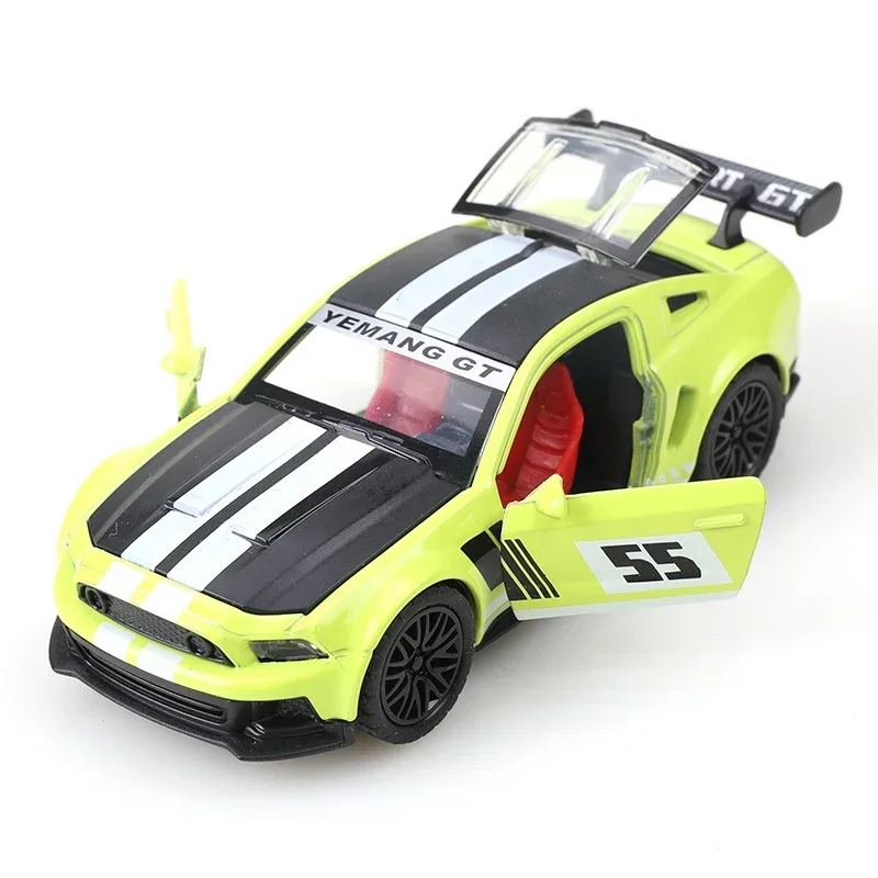 Experience the thrill of owning a meticulously crafted alloy model car that captures the essence of a sleek sports vehicle. With its vibrant neon yellow color complemented by striking black and white racing stripes, this 1:36 scale model exudes speed and agility. The detailed front showcases a smooth, aerodynamic bumper and blacked-out grille, while the side profile features intricate black multi-spoke wheels and sporty decals. The large rear spoiler adds an aggressive touch, emphasizing its high-performance design. The clear windshield reveals a tiny interior with red seats and dashboard, and the doors open perfectly, adding realism and play value. This model combines aesthetic appeal with functional features, making it an impressive addition to any collection or décor.