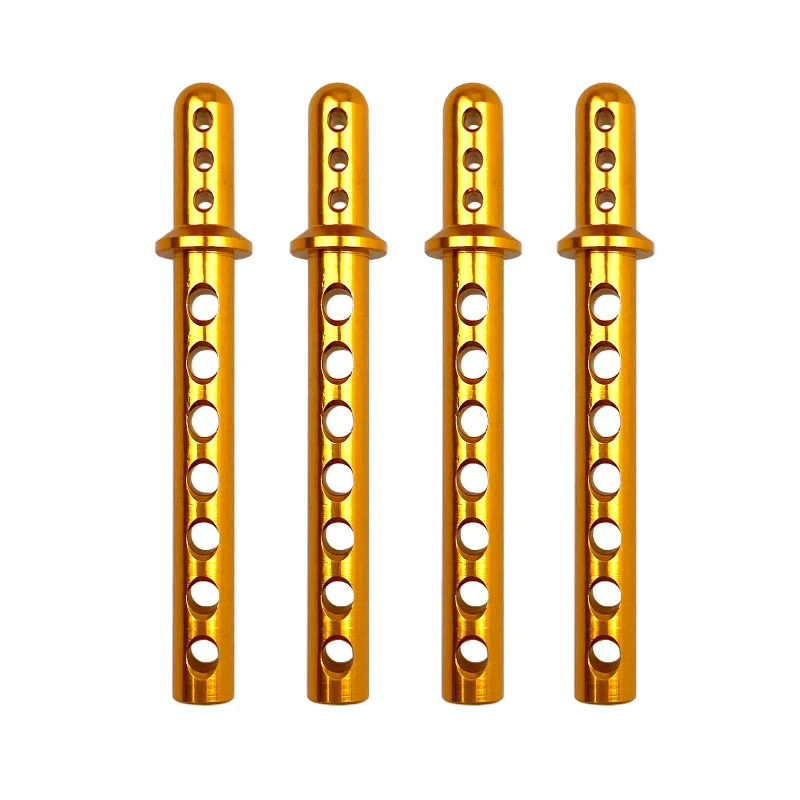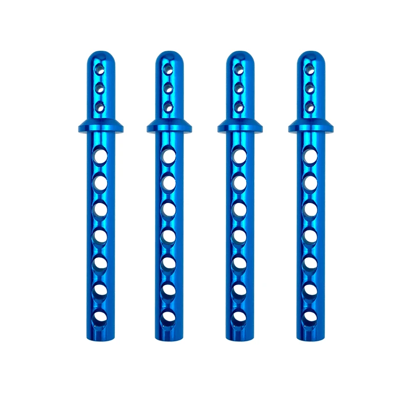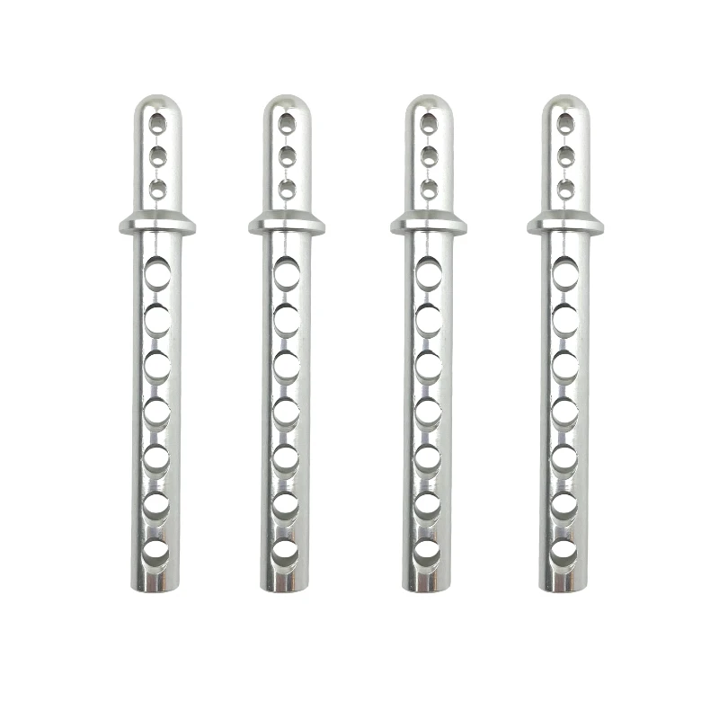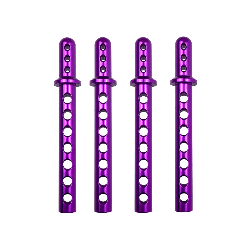 Experience a sleek upgrade with this set of four aluminum alloy posts, specially designed for 1/8 scale off-road RC vehicles. Crafted from lightweight, durable aluminum, these posts feature a polished, reflective metallic finish that adds a modern touch to your car's aesthetic. The vibrant colors—purple, gold, blue, and silver—ensure your vehicle stands out on any terrain. Each cylindrical post includes a rounded top with evenly spaced circular holes, perfect for mounting or adjustability. The wide flange in the middle reinforces structural integrity and offers a clean, streamlined look. These posts are easy to install and will enhance both the appearance and durability of your RC monster truck or off-road car, giving it a customized, high-performance feel.