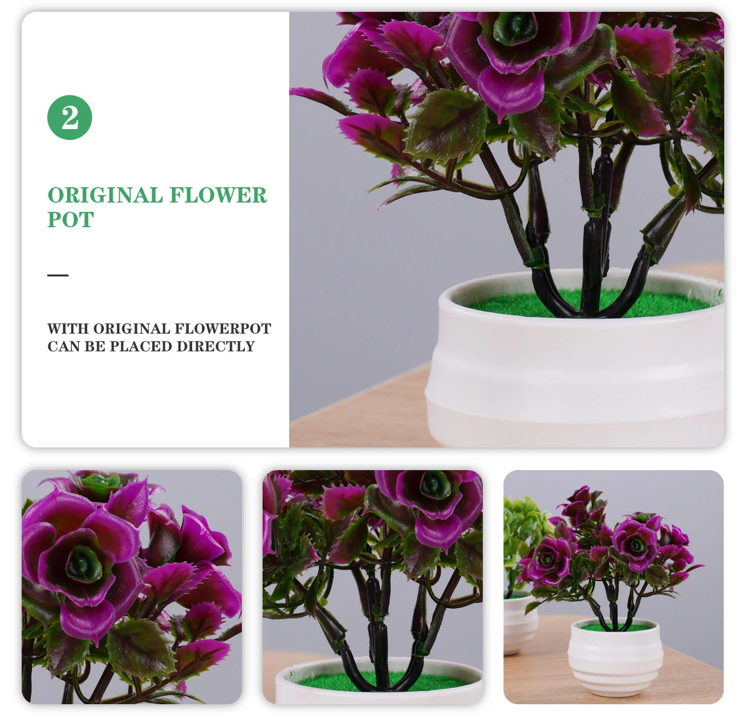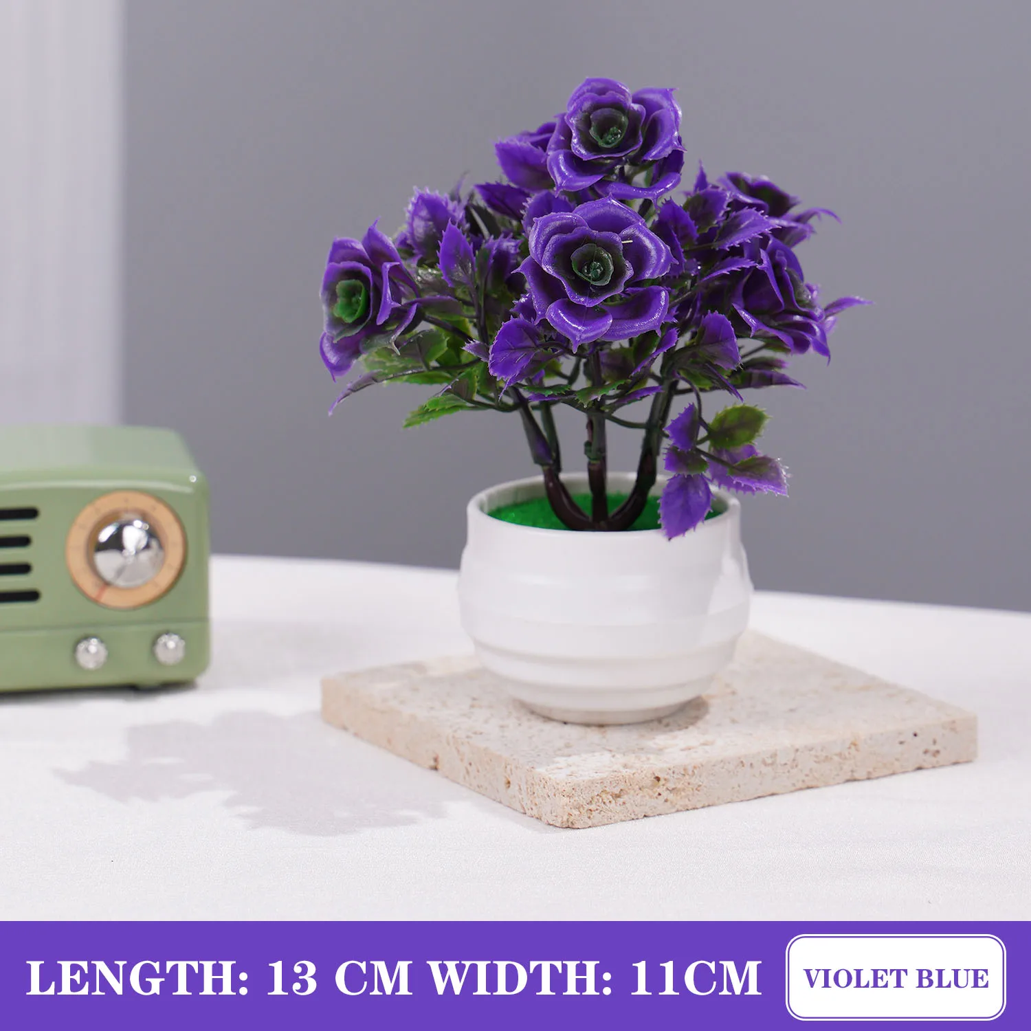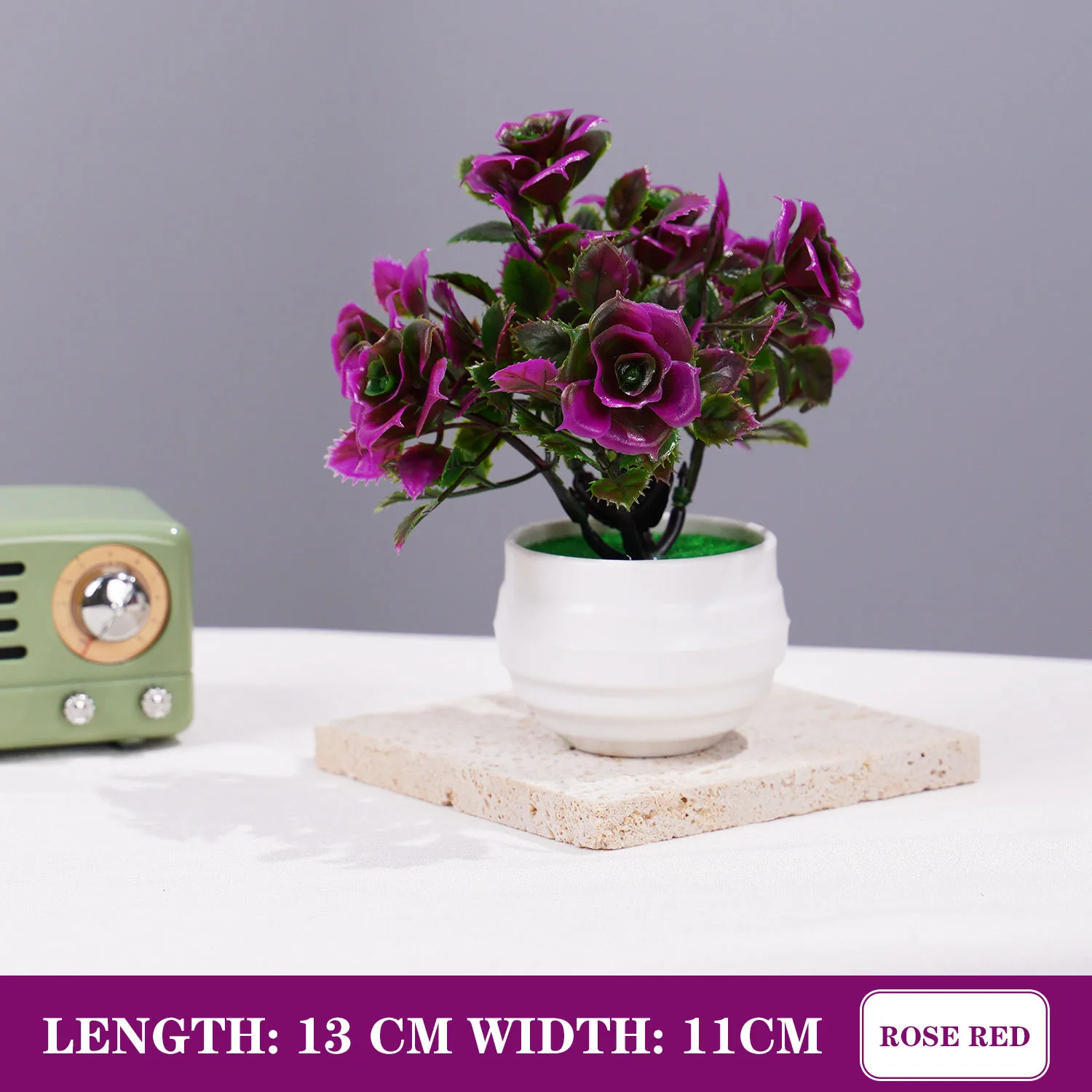 Transform your environment with this beautifully designed artificial bonsai, bringing a fresh, lively accent to your home or office decor. Crafted from durable plastic, it features vivid purple flowers with ruffled, layered petals and contrasting dark centers, creating an eye-catching focal point. The compact size of approximately 11 x 13 centimeters makes it ideal for desktop, tabletop, or shelf placement. The small cluster of glossy green leaves, subtly tinged with purple or reddish hues on the edges, adds a realistic touch to its aesthetic. The white ceramic pot with a smooth, matte-finish complements the vibrant colors, making the entire piece a perfect decorative accent. Its realistic appearance and bright palette bring nature’s beauty indoors effortlessly, creating a welcoming atmosphere.