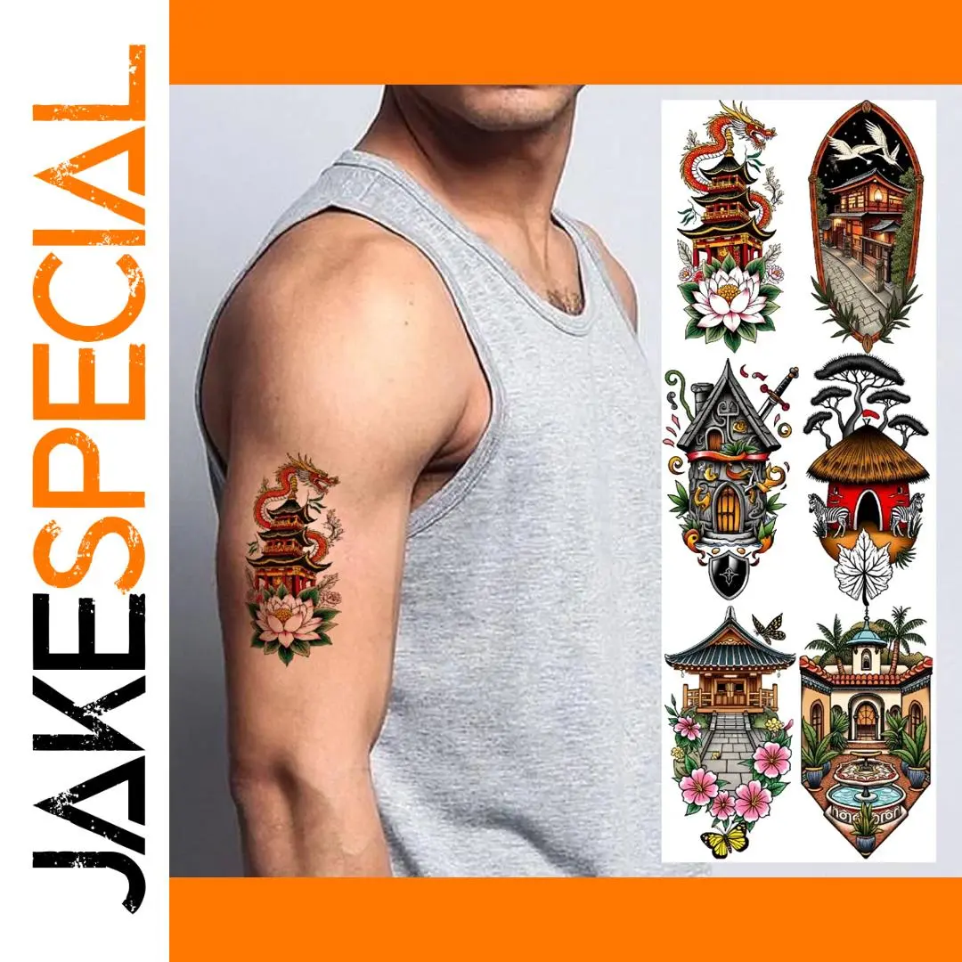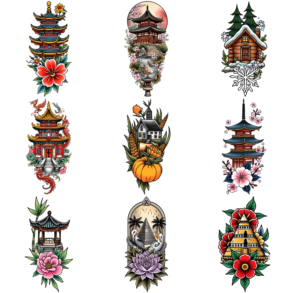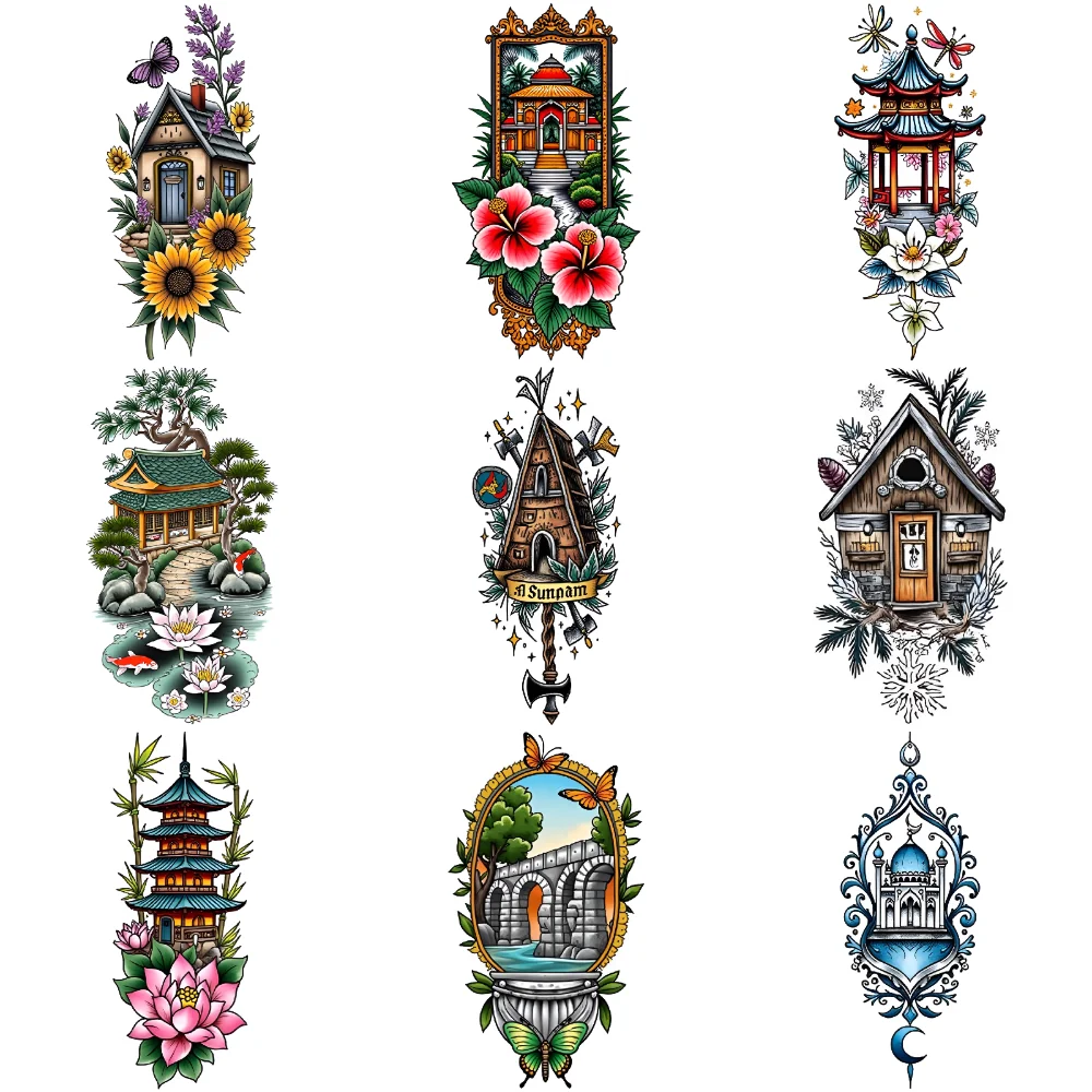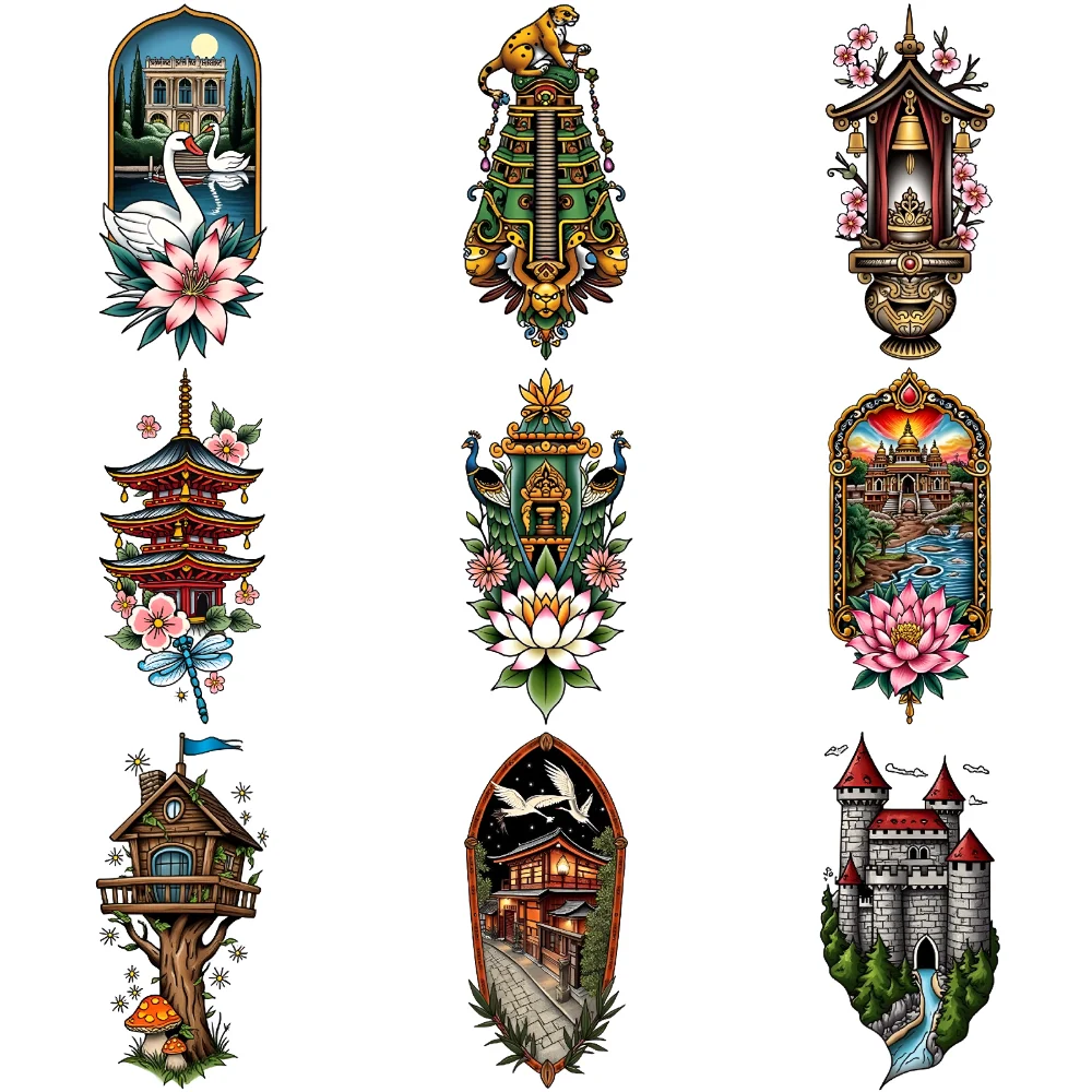 - Contains nine waterproof, durable tattoo stickers measuring about 9x6cm, featuring traditional Asian architectural and floral motifs with intricate details and vibrant colors.