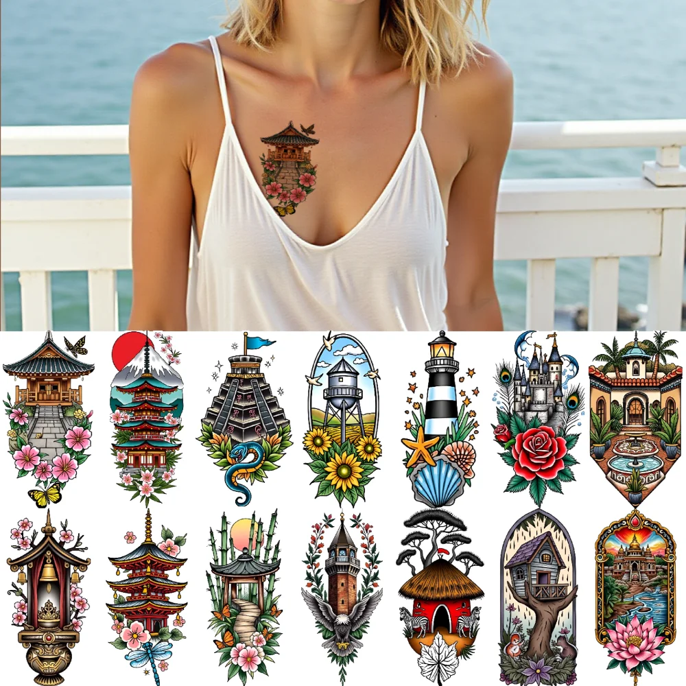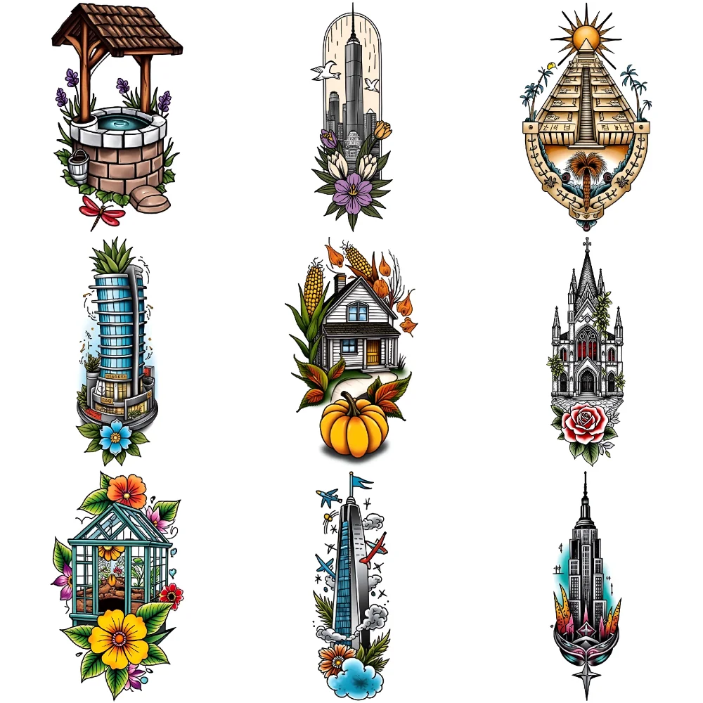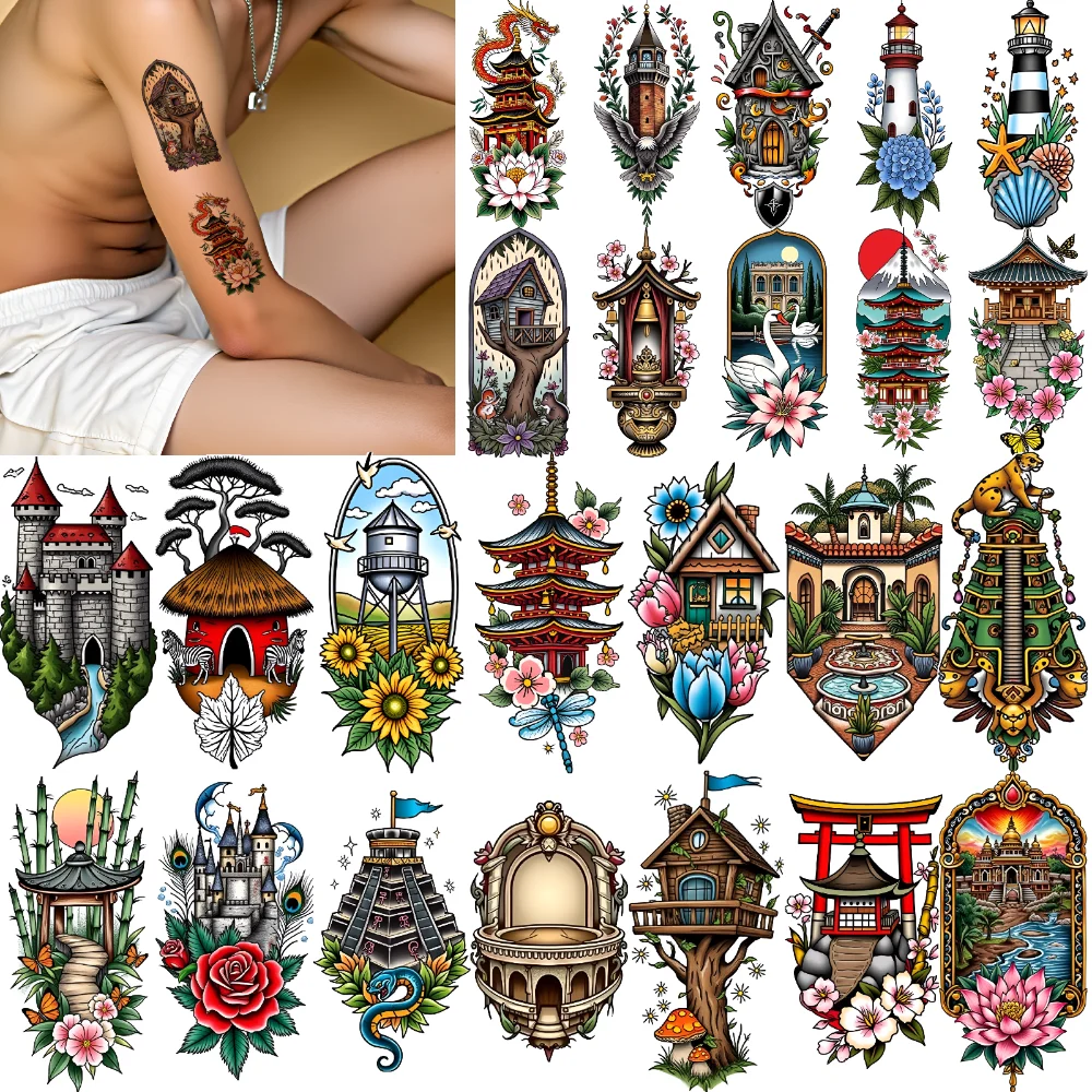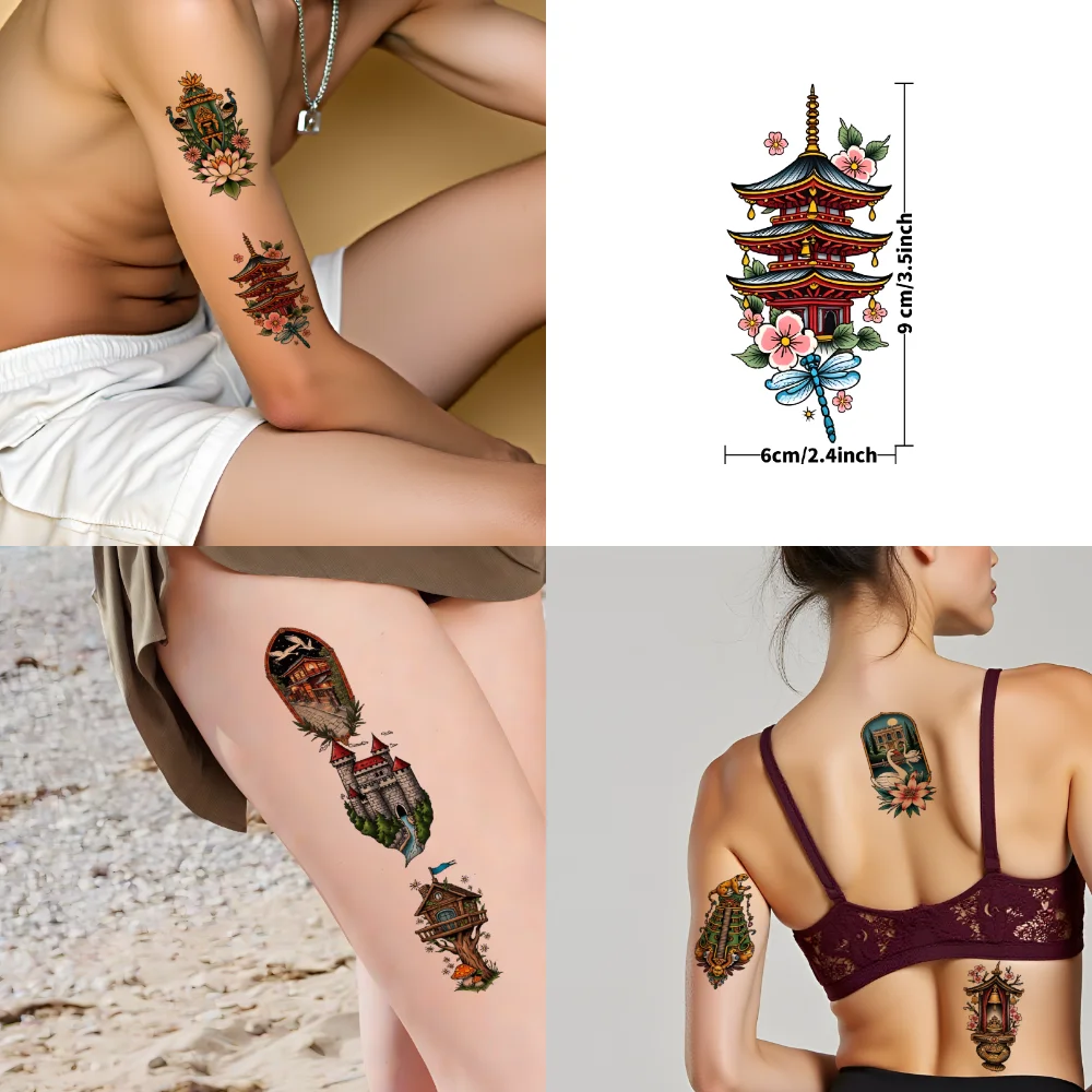 - Contains nine waterproof, durable tattoo stickers measuring about 9x6cm, featuring traditional Asian architectural and floral motifs with intricate details and vibrant colors.
