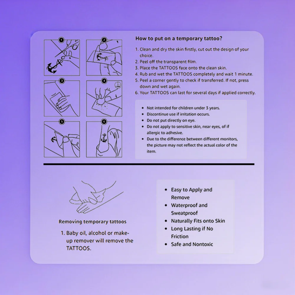- Each tattoo is waterproof, resistant to rain and sweat, lasting between 3 and 7 days, perfect for outdoor events, parties, and holidays, with vivid ink to maintain brightness over time.