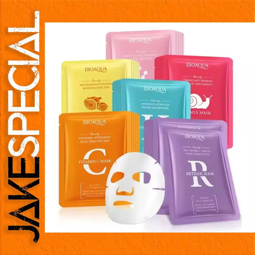 Experience revitalizing skincare with this set of 5 or 10 facial masks, each weighing 30g and designed for full-face application. Enriched with active ingredients like snail hyaluronic acid essence and retinol, these masks deliver deep moisturizing, hydrating, and firming benefits. Variants include formulations with hyaluronic acid, nicotinamide, turmeric, vitamin C, and retinol, available in concentrations of 5 or 10 pieces per ingredient. Packaged individually in liquid form, these masks offer a fresh, vibrant aesthetic with colorful, modern wrappers in orange, purple, yellow, light blue, red, and pink. Perfect for nourishing skin with a simple, effective routine, they promise a nourishing experience that leaves your face feeling refreshed, youthful, and radiant.