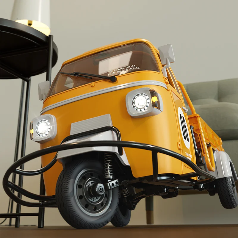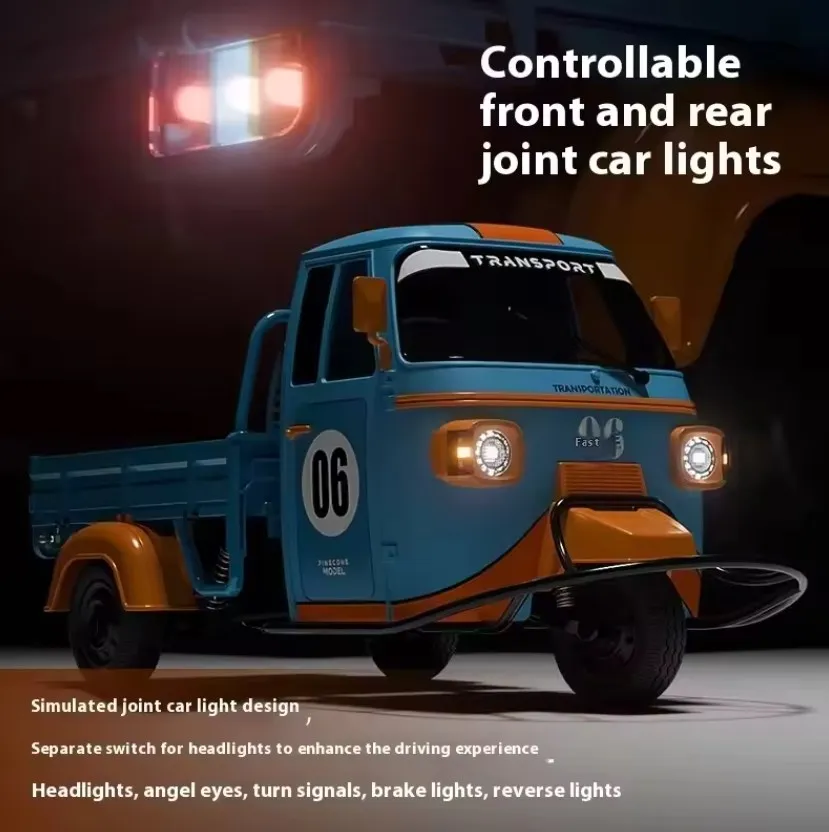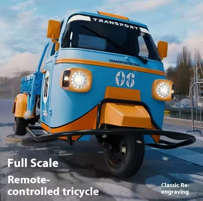 Experience the thrill of owning this captivating 1:10 scale blue remote control tricycle, designed for enthusiasts 14 years and older. Its playful, rounded cab-over-engine shape evokes a miniature truck, perfect for collectors and hobbyists alike. The vivid blue color, accented with bright orange details on the bumper, roof stripe, side mirrors, wheel arches, and side rails, creates an eye-catching look that invites admiring glances. The broad, curved windshield and large side windows enhance its approachable, fun aesthetic. Built with realistic touches like textured black tires and prominently rounded wheel wells, this RC vehicle combines bold design with practical features—perfect for outdoor adventures and display. Its compact size makes it easy to handle while delivering impressive speed and control.