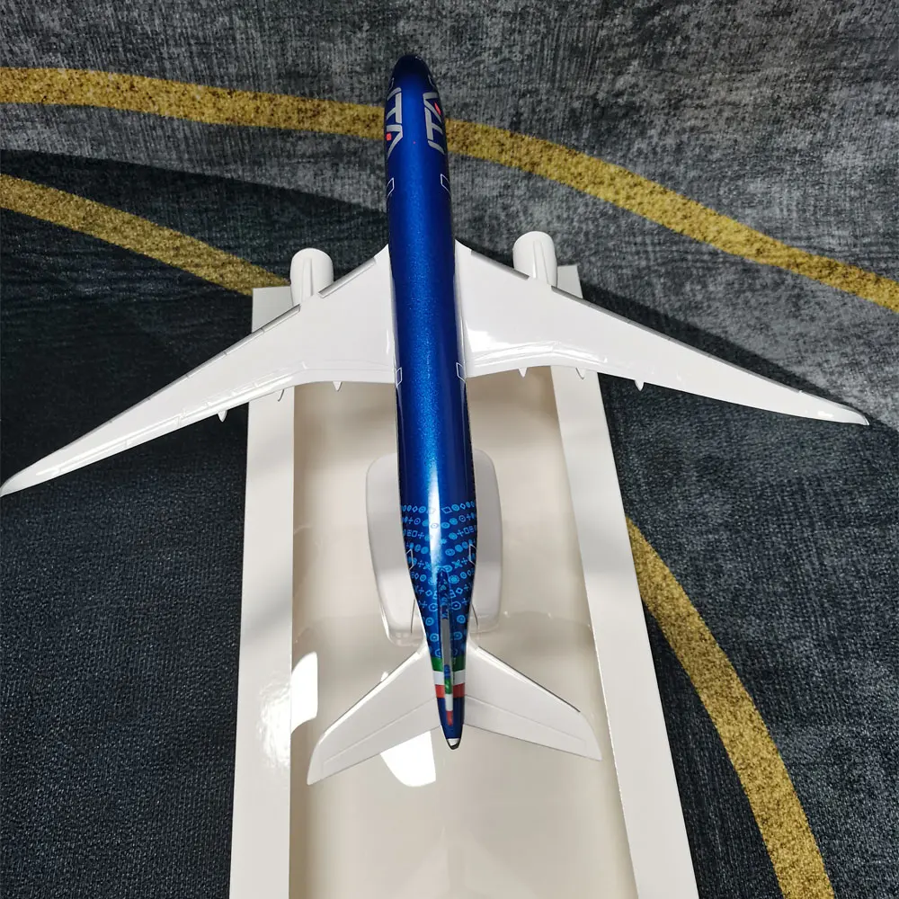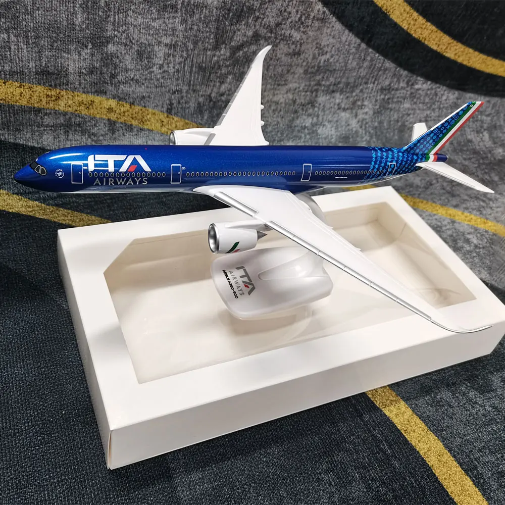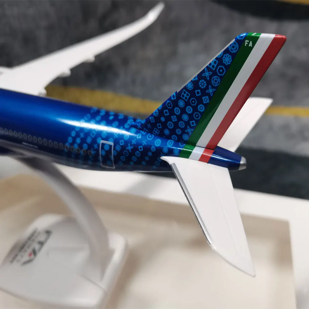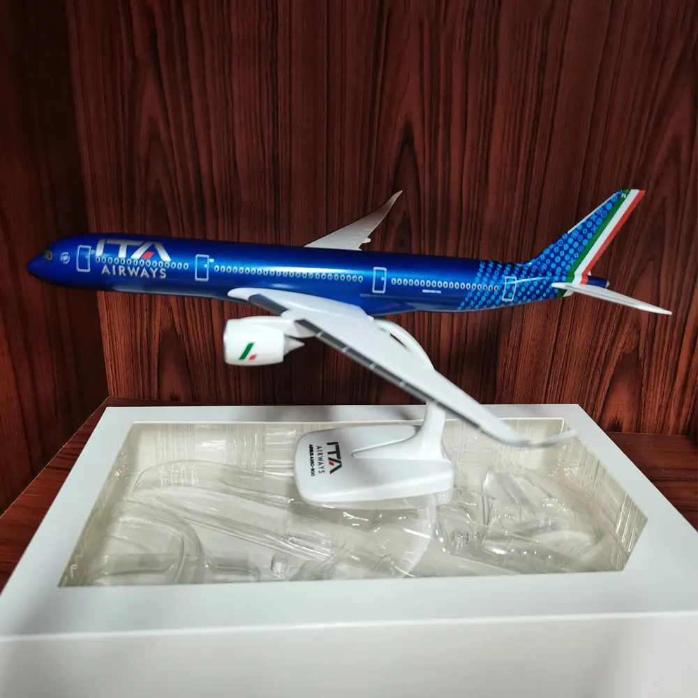 Experience the realism of the A350 Italy ITA aircraft with this 36 cm long, 1:200 scale model, crafted from durable ABS plastic, resin, and alloy. Designed for adult collectors, it features a sleek blue fuselage with a striking tricolor tail pattern of green, white, and red, complemented by white wings and engines with detailed markings and metallic accents. The model includes a display base with wheels, and the detachable wings and wheels allow for assembly and customization. Its smooth finish and precise detailing make it an eye-catching addition to any collection or decorative display, perfect for aviation enthusiasts who appreciate craftsmanship and authenticity.