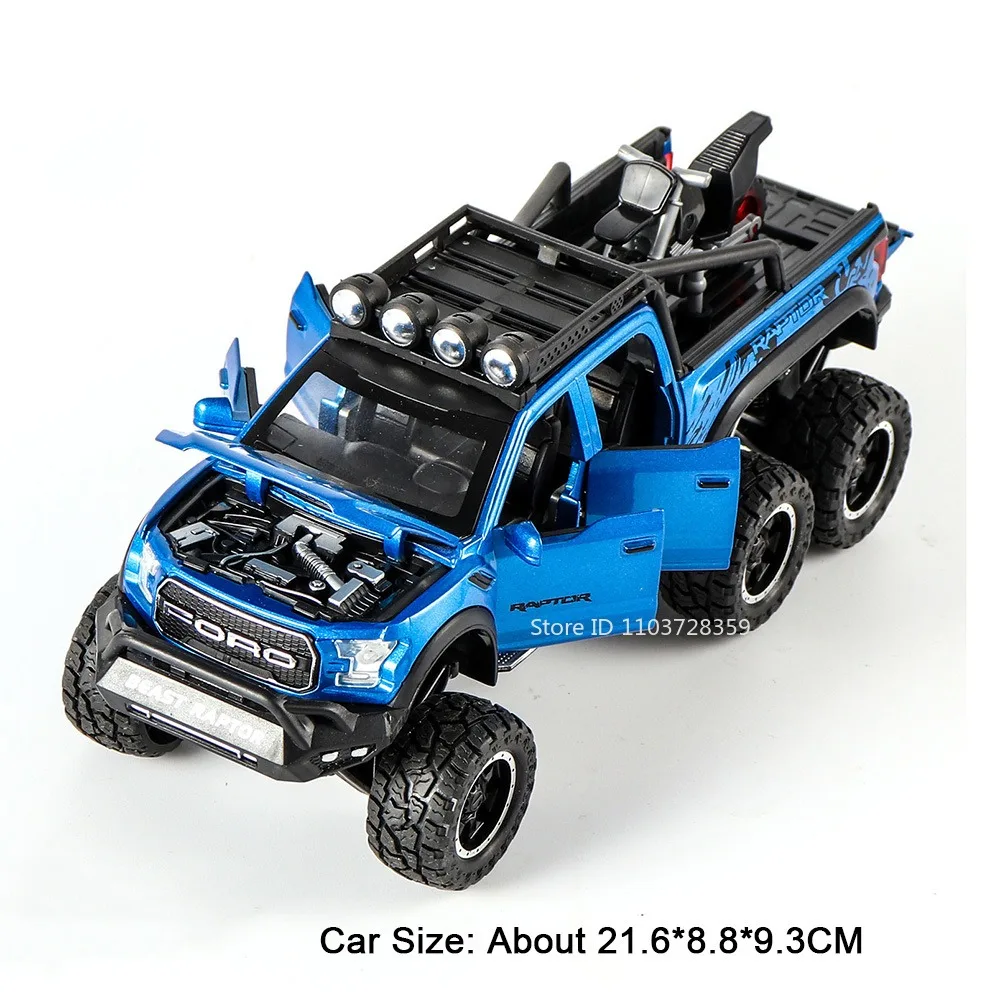 Experience the thrill of outdoor adventure with this detailed 1:24 scale diecast model of a Raptor F150 Camping RV. Carefully crafted with a bright blue finish, it captures the rugged spirit of off-road exploration. The model features a robust alloy metal body, complemented by a durable plastic chassis and textured rubber tires, ensuring resilience during play. Its realistic design includes opening doors, engine hood, and trunk, satisfying curiosity about real vehicles. When pressed on the body or front wheels, the model activates authentic sound and light effects, adding to the immersive experience. A pull-back function allows smooth forward movement, making it perfect for dynamic displays or active play. This model is an ideal gift for collectors and children aged 14 and above who love adventure and detailed collectibles.