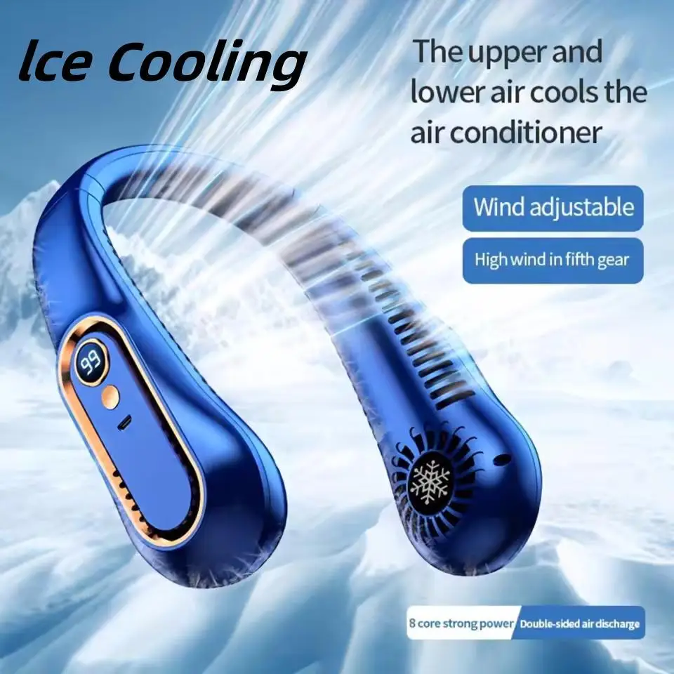 Experience ultimate cooling convenience with this vibrant blue hanging neck fan, designed for modern, active lifestyles. Its sleek, bladeless construction ensures safety while providing a smooth, uniform airflow thanks to turbine blades and cross-cut design. The digital display shows real-time temperature, allowing you to monitor your environment effortlessly. With five adjustable wind speeds, you can customize airflow intensity according to your needs, whether for outdoor activities or indoor comfort. Its lightweight and compact size makes it easy to wear and carry, while the multi-angle flexible neck strap offers personalized fit and hands-free operation. The USB rechargeable feature ensures you stay refreshed on the go, without the hassle of batteries. Elevate your cooling experience with this stylish, user-friendly device that combines safety, performance, and modern design in one package.