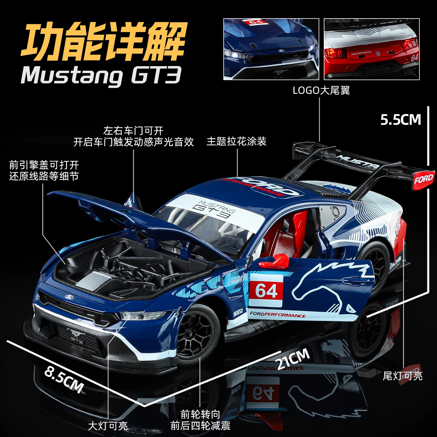 Experience the thrill of racing with this highly detailed, scaled-down Ford Mustang GT3 model in a stunning vibrant blue finish. Capturing the sleek, aerodynamic silhouette of a real racing car, this model features smooth contours, a low profile, and vivid design accents that highlight its performance vibe. The contrasting black grille, bumper details, and rear spoiler bring a dynamic edge, while the bright red side mirrors add striking pops of color. Transparent windows reveal intricate interior details, and racing decals such as a white horse silhouette and a red number square enhance its authentic racing appeal. Crafted from zinc alloy with rubber tires and ABS plastic components, this model offers exquisite realism and durability for collectible display or as a gift for a car enthusiast.