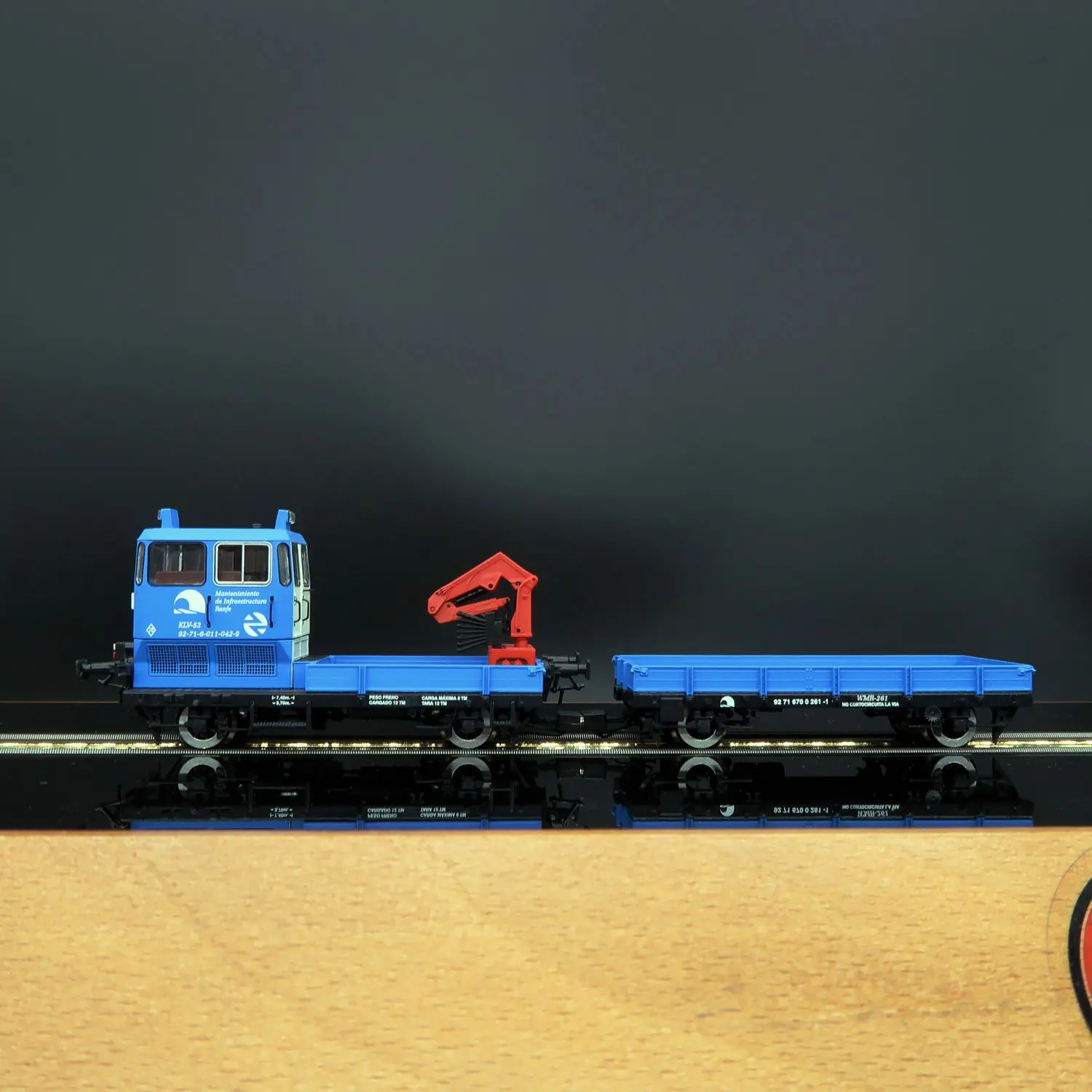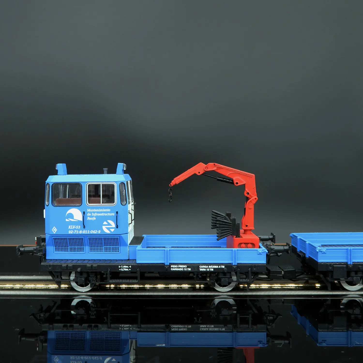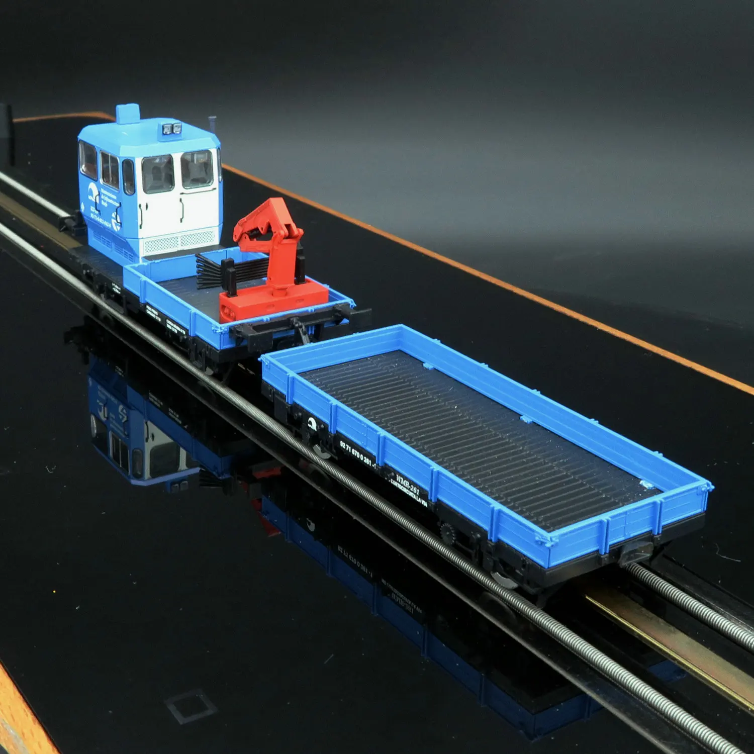 Experience the realism of railway modeling with this 1:87 scale HO gauge locomotive, designed for detailed display and model train enthusiasts. Made from durable ABS plastic, it features vibrant blue coloring accented with black and white details, including a rectangular cab with dark-tinted windows, realistic panel lines, rivets, and molded vents atop the body. The front showcases black couplers and buffers with yellow and black safety stripes, while the flat cargo car behind maintains the same vivid hue with raised edges. Mounted on textured plastic ties with embossed gravel ballast, this non-electric model offers two operation options: DCC or DC, compatible with standard digital or analog controllers (not included).