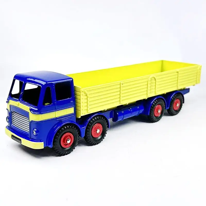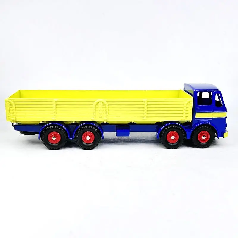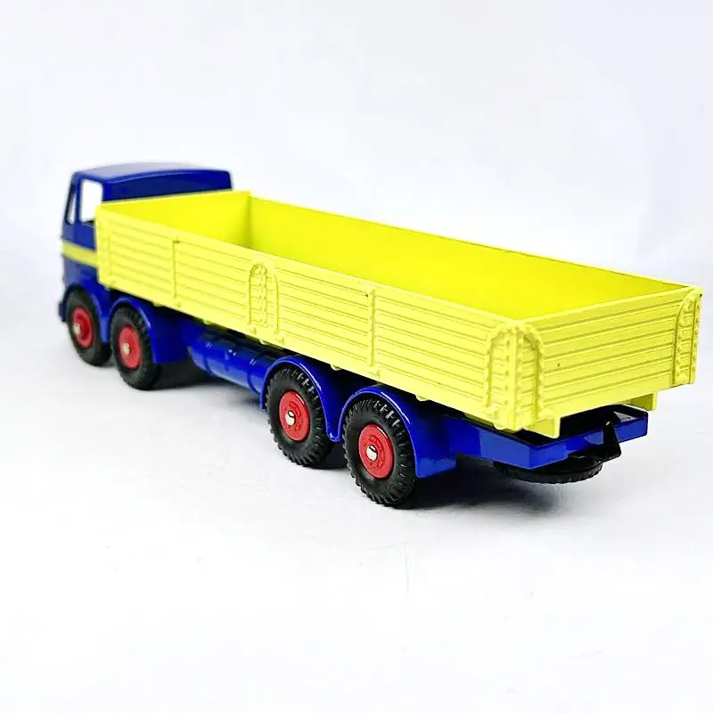 Discover this vibrant 1:43 scale diecast alloy model of a Leyland Octopus Wagon, featuring a striking blue cab with a yellow stripe across the middle and wheel arches. The model showcases a boxy, vintage-inspired design with a flat front, large windshield, detailed side windows, and a silver grille with molded headlights. The bright yellow cargo bed has vertical ridges resembling wooden planks and a curved rear arch. With six red hubcap wheels and textured tires, this collectible miniature emphasizes bold primary colors—blue, yellow, and red—and sturdy materials for a nostalgic, playful aesthetic. Ideal for enthusiasts and collectors aged 14 and above.