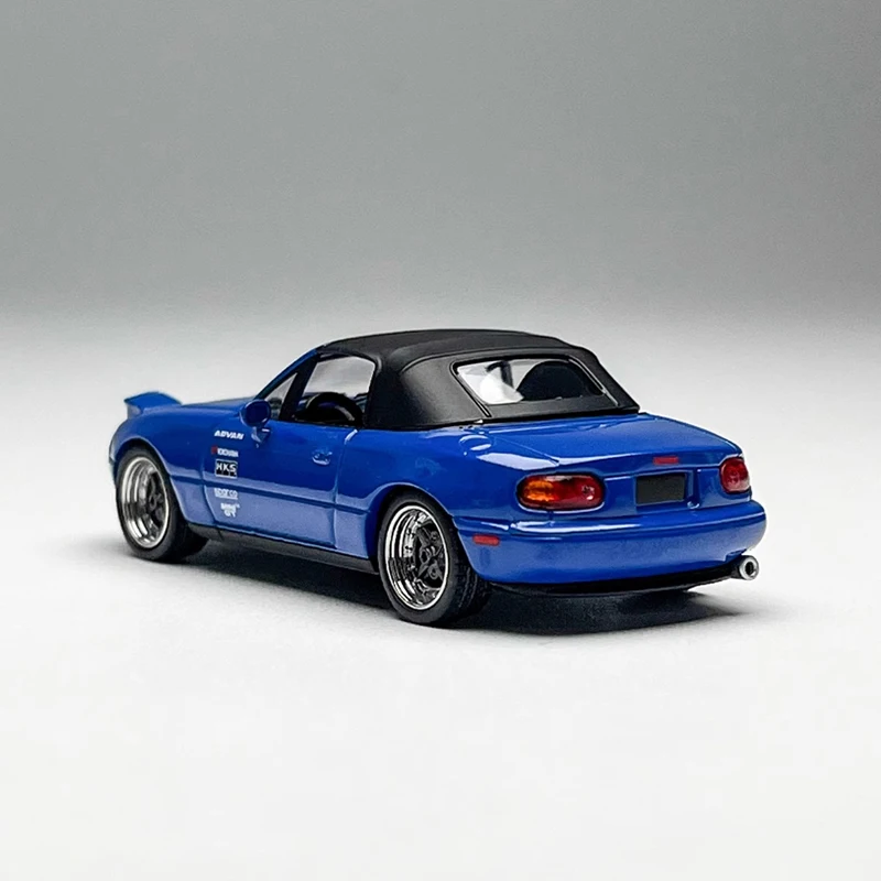 - Features a vibrant blue metallic body with a contrasting black soft top, capturing the sporty and stylish essence of the original MX-5 model with exceptional craftsmanship and fine detailing.