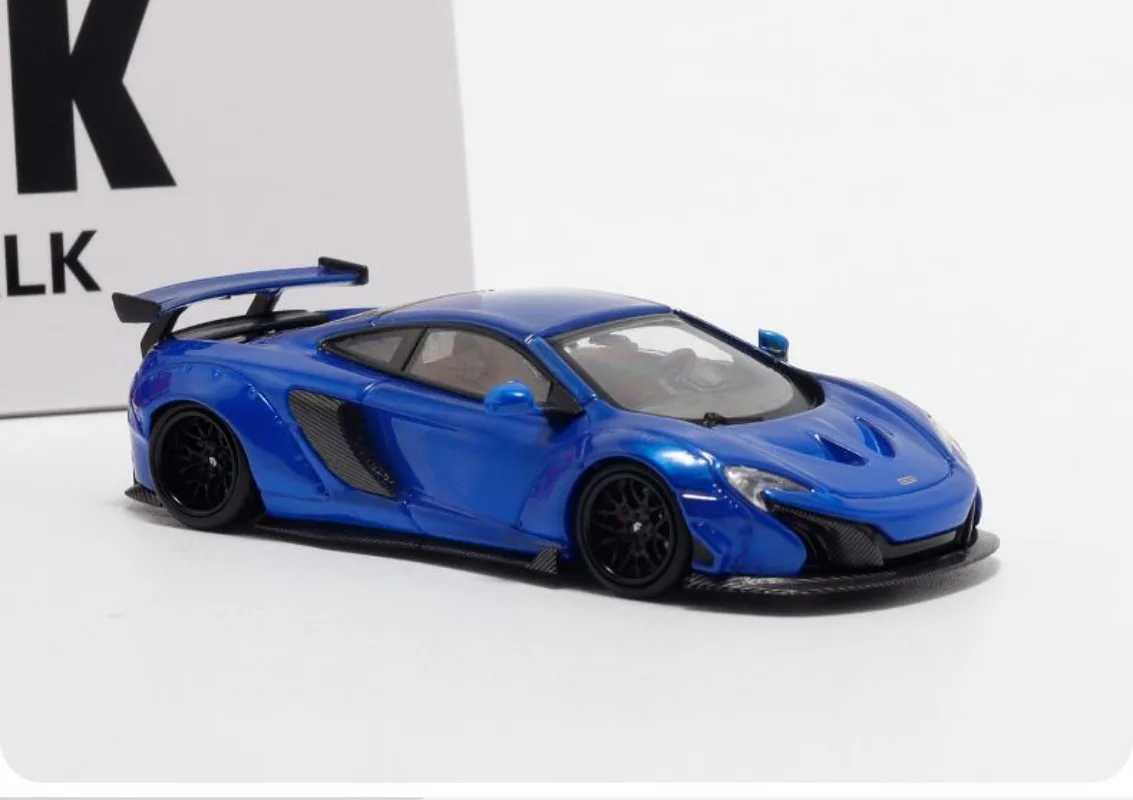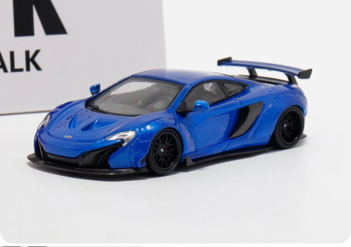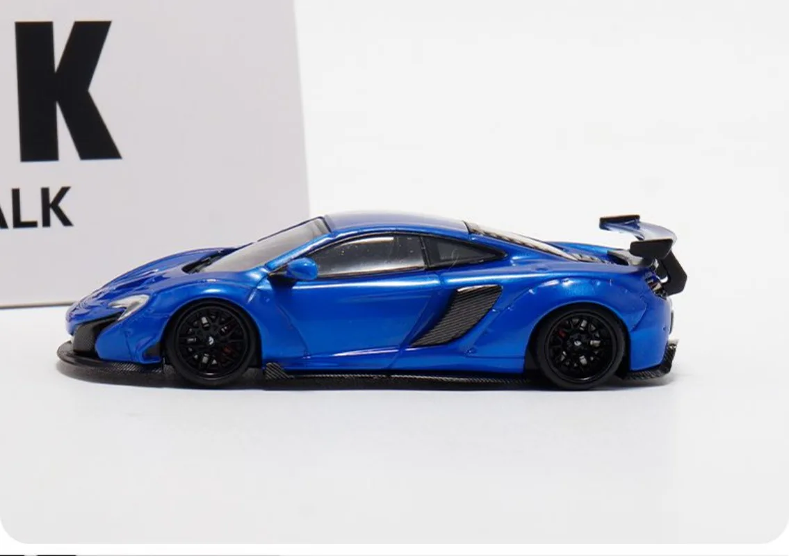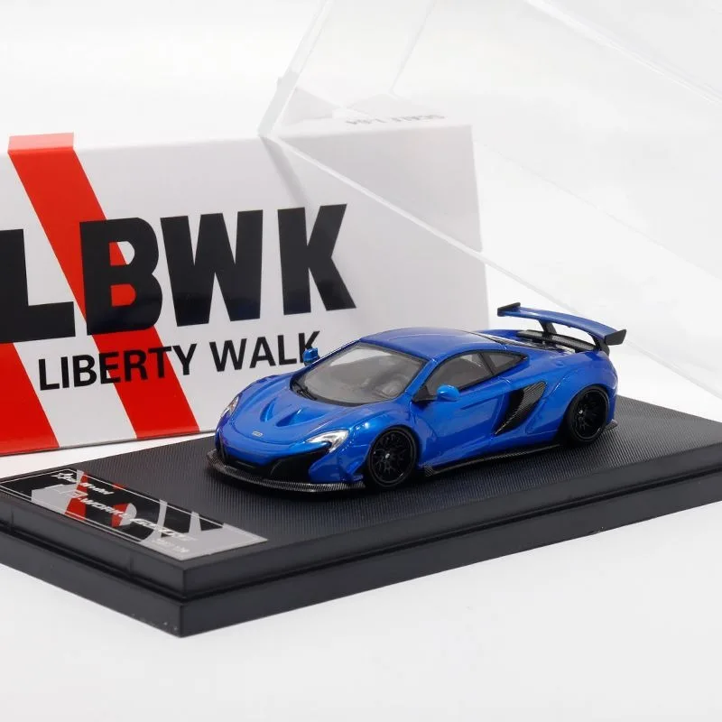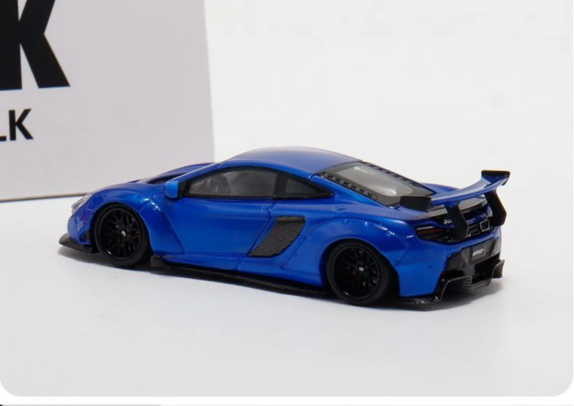 This 1:64 scale diecast model of the McLaren 650S LBWK features a vibrant blue, glossy finish with a sleek, aerodynamic wide-body design, highlighted by sharp lines, smooth curves, and race-inspired details such as side air intakes and a large rear wing spoiler. Crafted from metal, plastic, and rubber, it includes multi-spoke black wheels, sculpted headlights, clear windows, side mirrors, and a matte black rear diffuser, providing a highly realistic and collectible appearance. Perfect for enthusiasts and collectors aged 14 and older, this model serves as an eye-catching home or car decoration and makes an impressive gift.