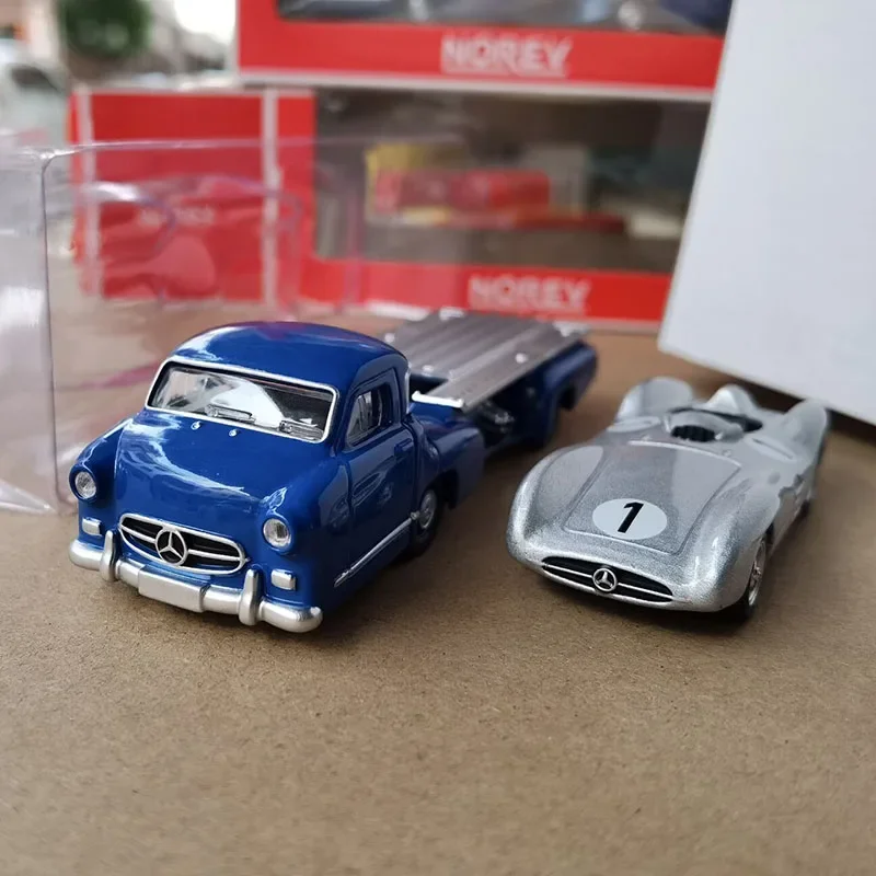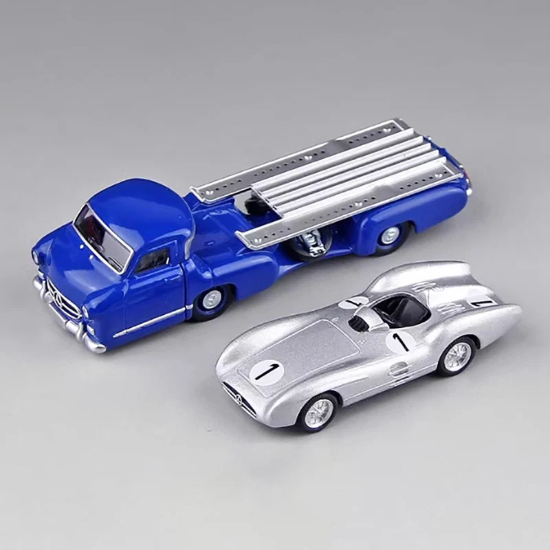 This 1:64 scale diecast model set features a vibrant glossy blue Mercedes-Benz Miracle Transporter truck with a polished silver Arrow Racing W196R model car on its flatbed. The truck measures approximately 8 cm in length, crafted from alloys and plastics, and showcases a vintage-inspired, streamlined design with a rounded front grille, circular headlights, and smooth contours. The sleek silver race car exhibits a low-profile, aerodynamic shape with detailed features such as a rear spoiler and front air intakes. Perfect for display, collection, or gifting, this static ornament offers a nostalgic and sporty aesthetic, enhancing any collector’s display with its vivid colors and refined craftsmanship.