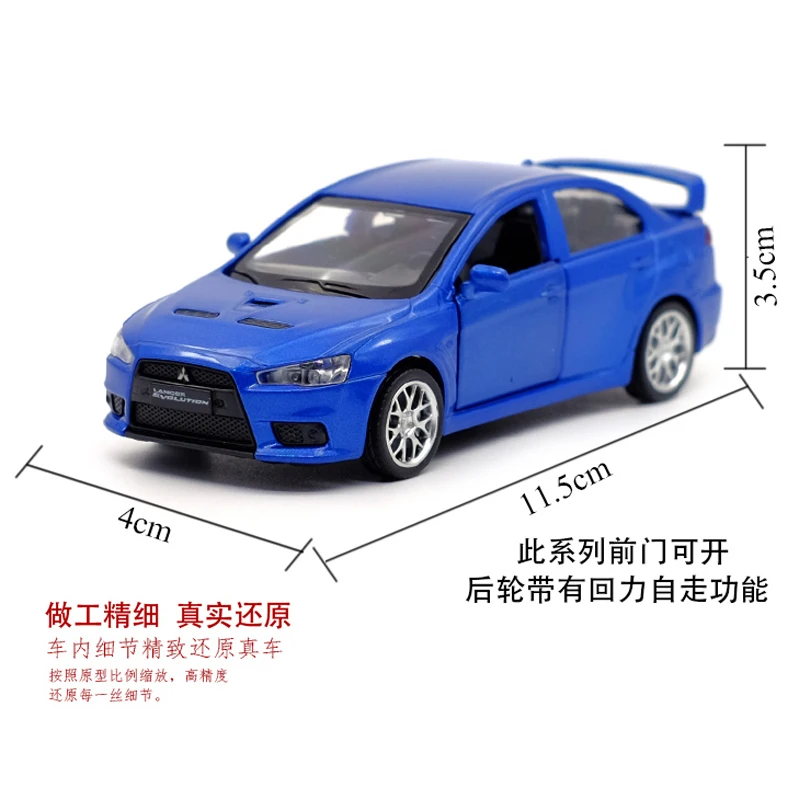 Experience the thrill of owning this detailed, bright blue diecast model of the iconic Mitsubishi Lancer-EVO Lution. Crafted with precision, this scaled-down replica measures 4.5 cm high, 11 cm long, and 3.5 cm wide at a 1:41 scale. Its aerodynamic body features sharp contours, signature vents on the hood, and a prominent rear spoiler, capturing the sporty essence perfectly. The shiny metallic surface, white alloy-like rims, and molded plastic tires add to its realism. With functional doors that open smoothly and a pull-back mechanism that makes it easy to showcase or play, this model offers both educational and collectible value. Its bold design embodies the spirit of rally racing, making it an attractive addition to any collection or playful display.