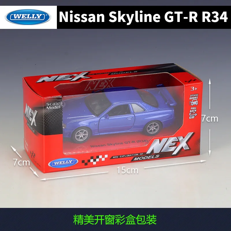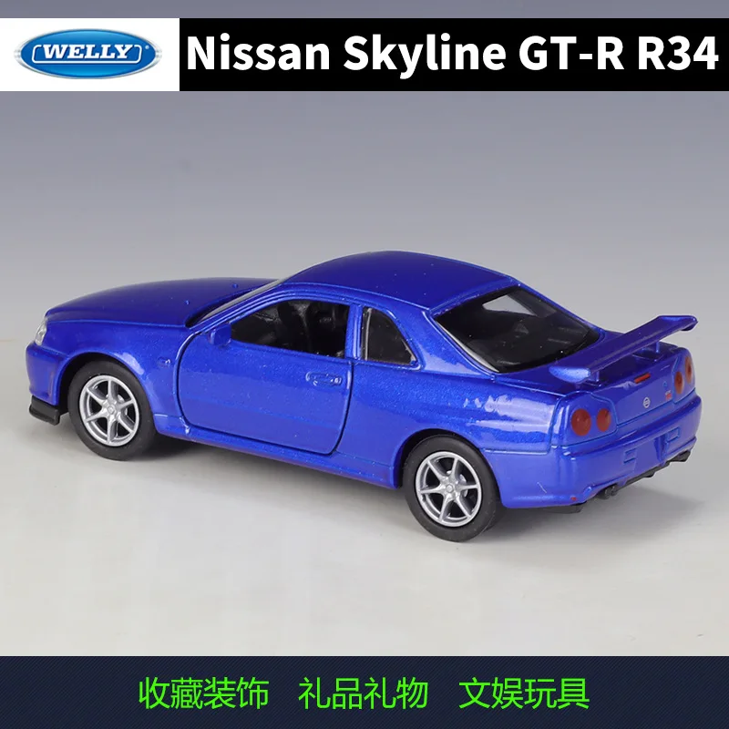 Immerse yourself in the authentic sportiness of this detailed diecast metal replica of the Nissan Skyline GT-R R34, scaled at 1:36. Perfect for passionate collectors and enthusiasts, this model captures the essence of the iconic vehicle with a vivid metallic blue finish that catches the eye. Its sleek, aerodynamic silhouette features smooth flowing lines, sculpted side panels, and a prominent rear wing spoiler. The clear, transparent windows reveal a proportionally accurate interior, while the front end showcases molded headlights and grille details. With realistic silver multi-spoke rims and black tires, it offers a lifelike stance. Crafted with high precision craftsmanship, this durable piece is an exquisite decorative collectible.