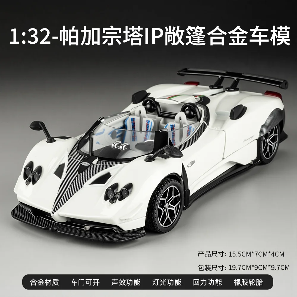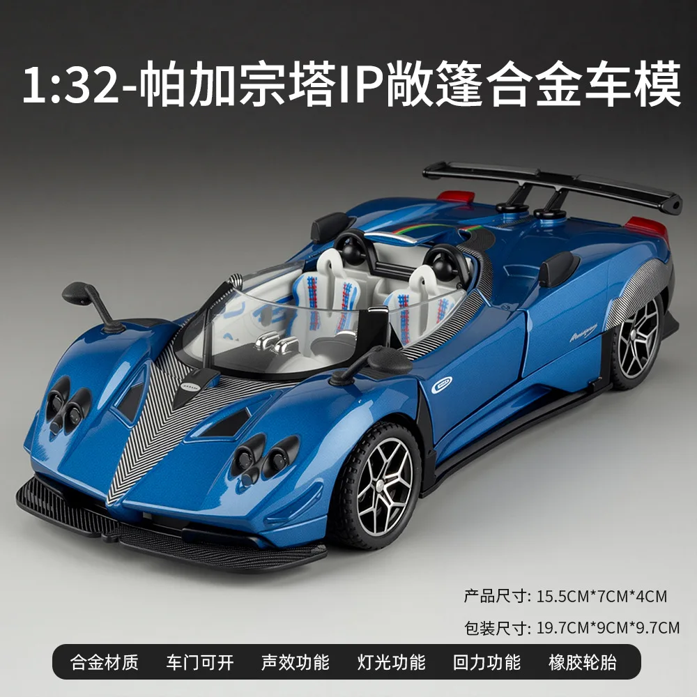 Experience owning this stunning 1:32 scale metal model of the legendary Pagani Zonda HP Barchetta. Its vibrant metallic blue finish captures light brilliantly, creating a luminous display that commands attention. The aerodynamic design boasts sharp, angular contours and a low, aggressive stance that echoes the high-performance spirit of the original supercar. Features include dual round headlights housed in black enclosures, a curved transparent windshield revealing multicolored striped racing seats, and a large black rear wing spoiler mounted on supports that add to its sporty appeal. The racing-inspired wheels with black rims and silver accents complete the dynamic aesthetic. Equipped with functional sound and light features activated by batteries and a pull-back mechanism for smooth movement, this model is crafted from durable high-quality metal, making it a perfect addition for collectors and car enthusiasts alike.