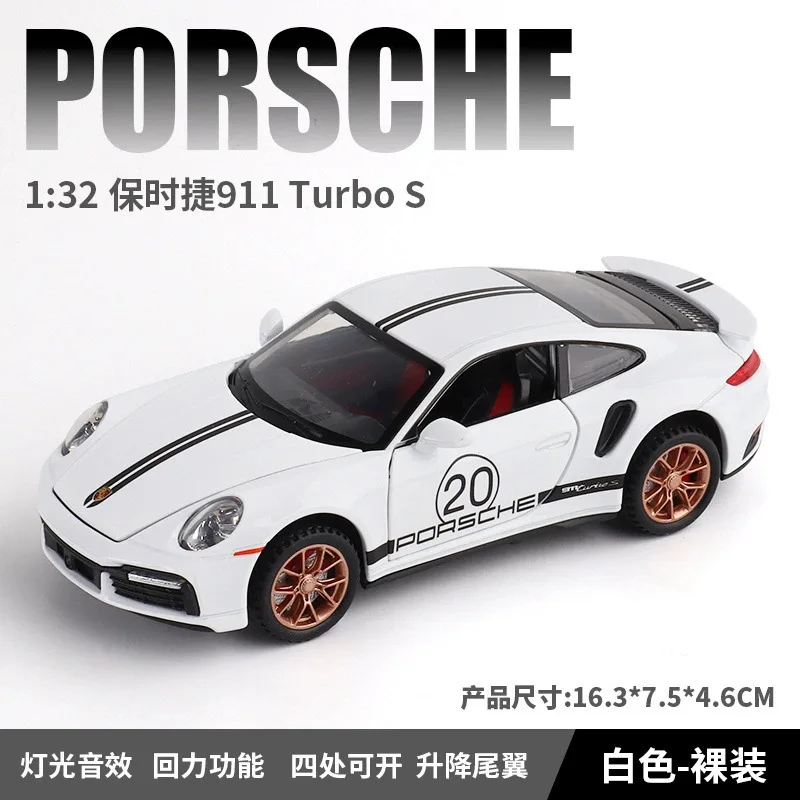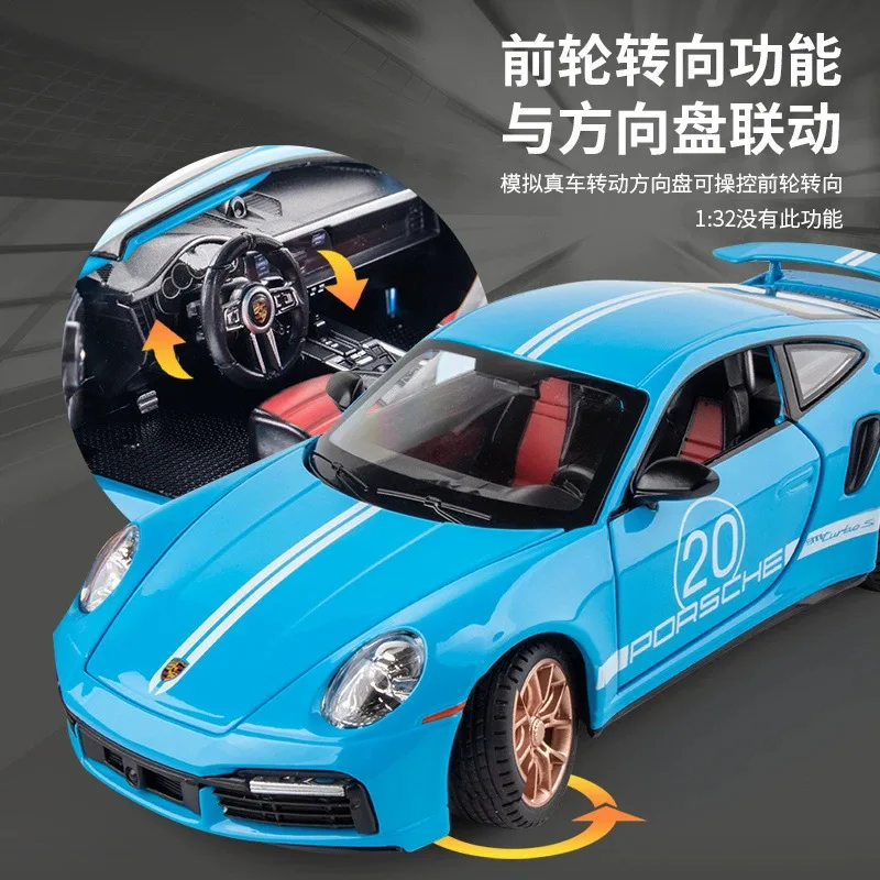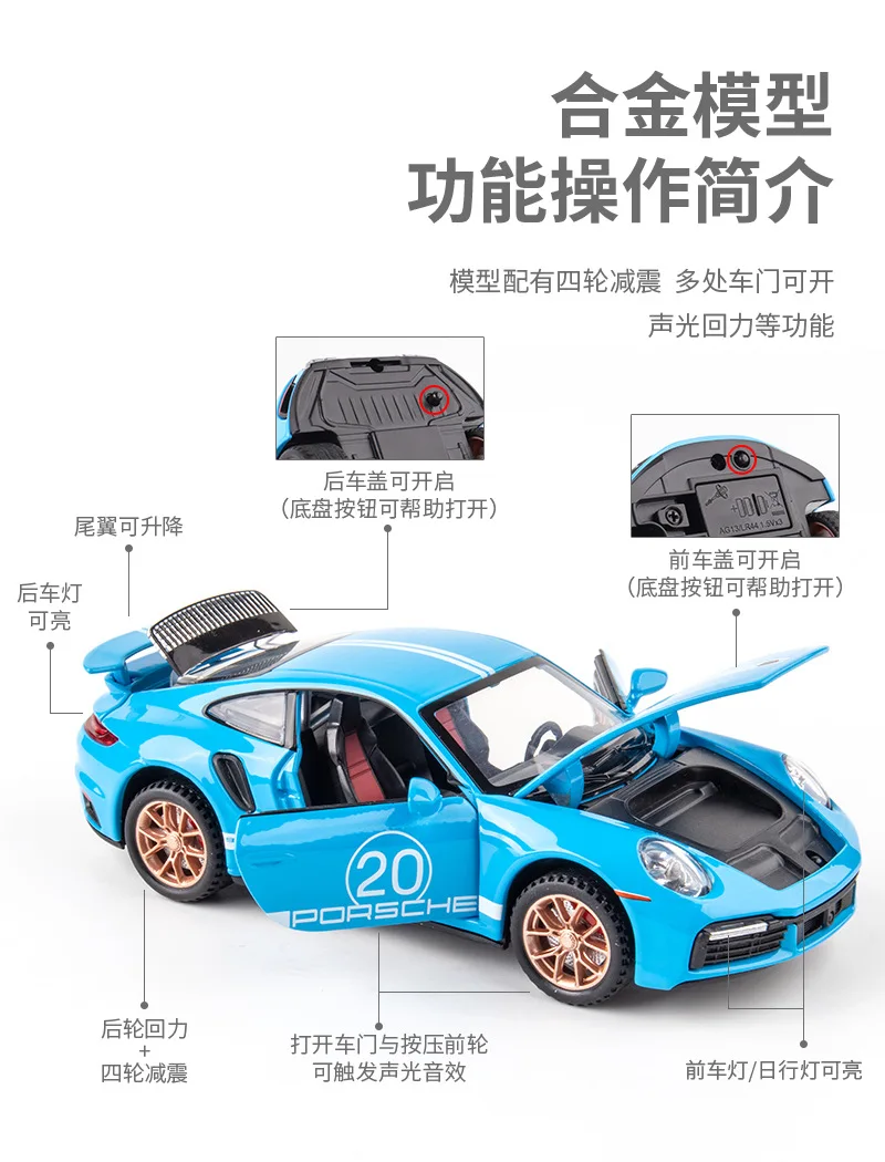 Experience the thrill of owning this meticulously crafted miniature replica of the iconic Porsche 911S. Made from high-quality diecast alloy, this 1:32 scale model captures every intricate detail, from its sleek, aerodynamic silhouette to the vivid, bright blue paint that accentuates its sporty appeal. The white racing stripe with the Porsche logo and the number 20 adds a dynamic touch, perfect for display or collection. Its precise multi-spoke bronze or gold rims, textured black tires, detailed taillights, and realistic side vents mimic real racing cars. The transparent windows reveal a finely designed interior with racing seats and a steering wheel, offering a lifelike visual. Ideal for enthusiasts and collectors alike, this model radiates energy, style, and craftsmanship.