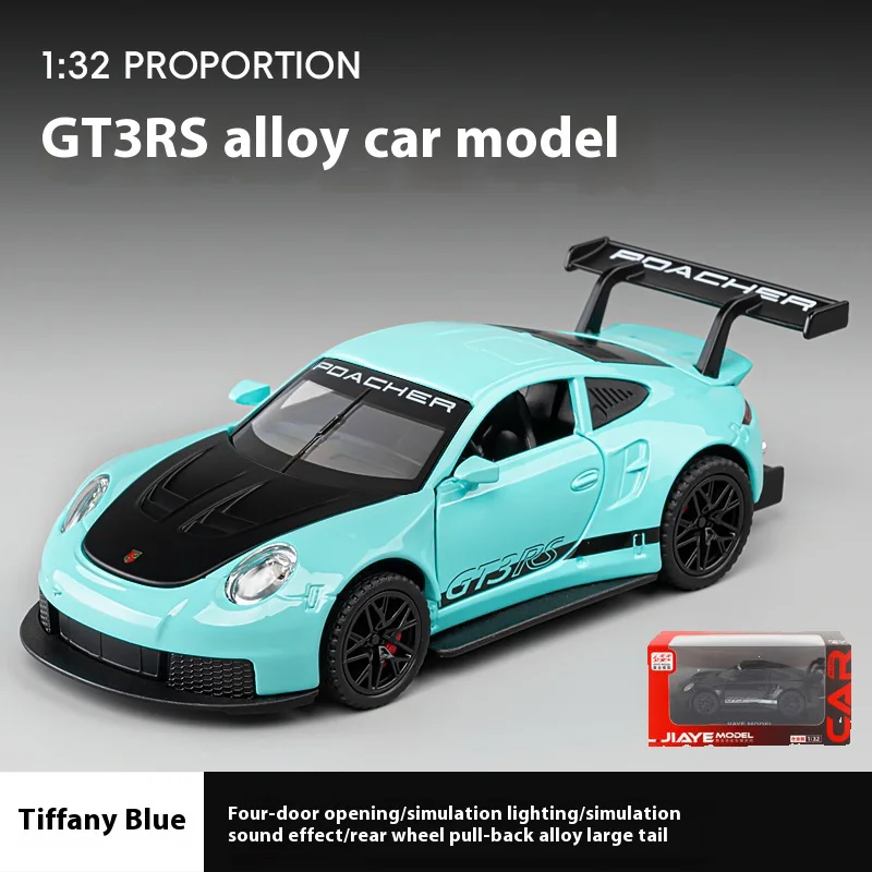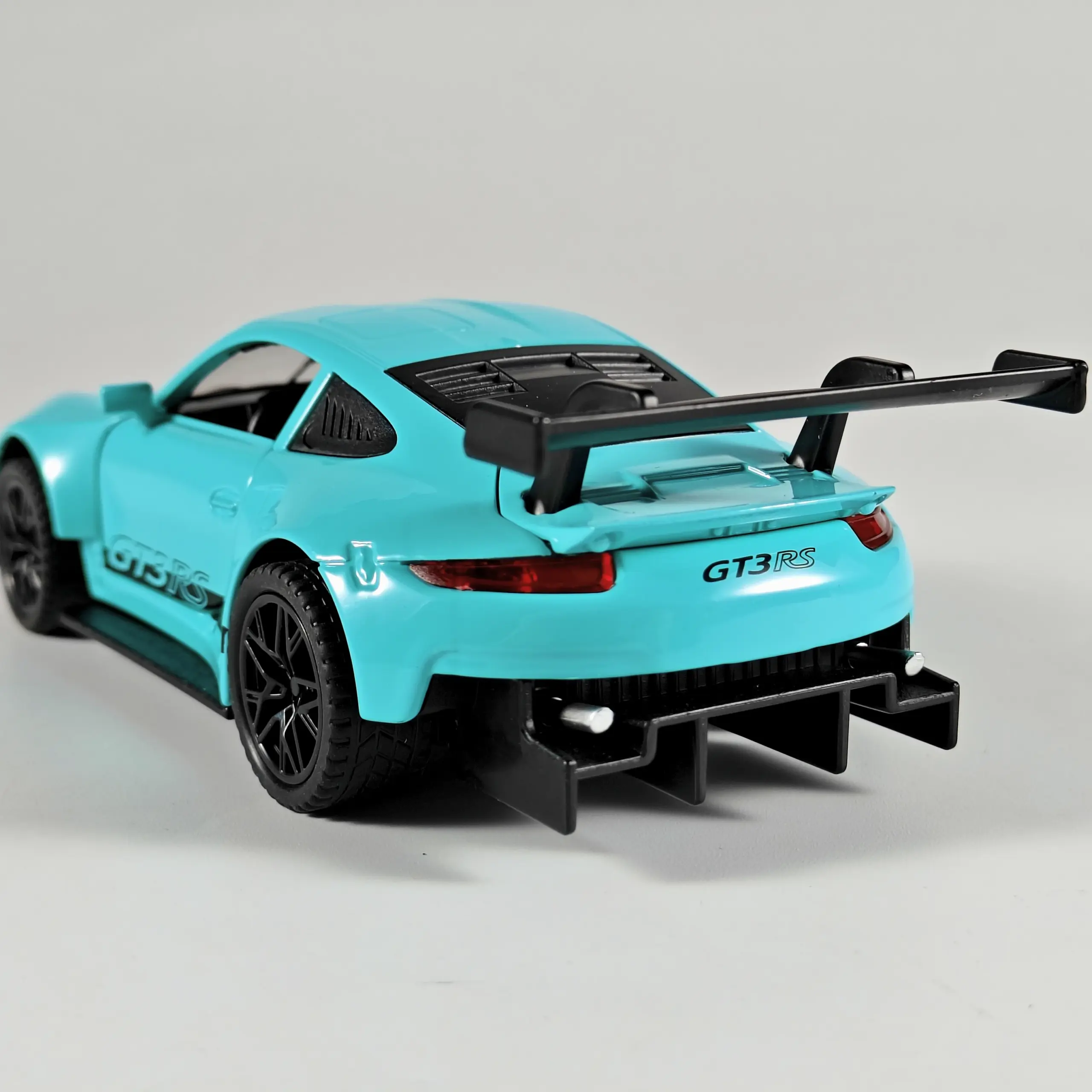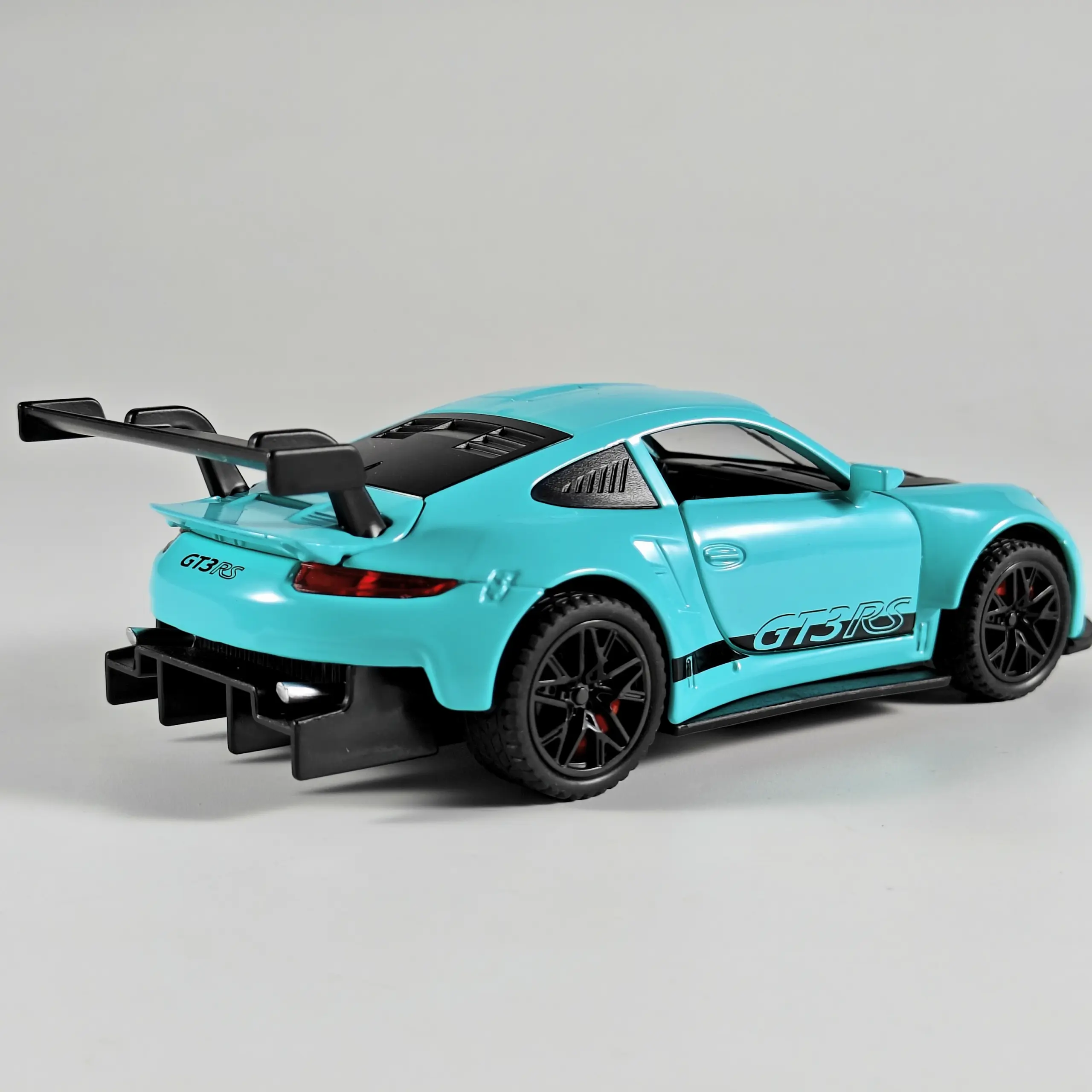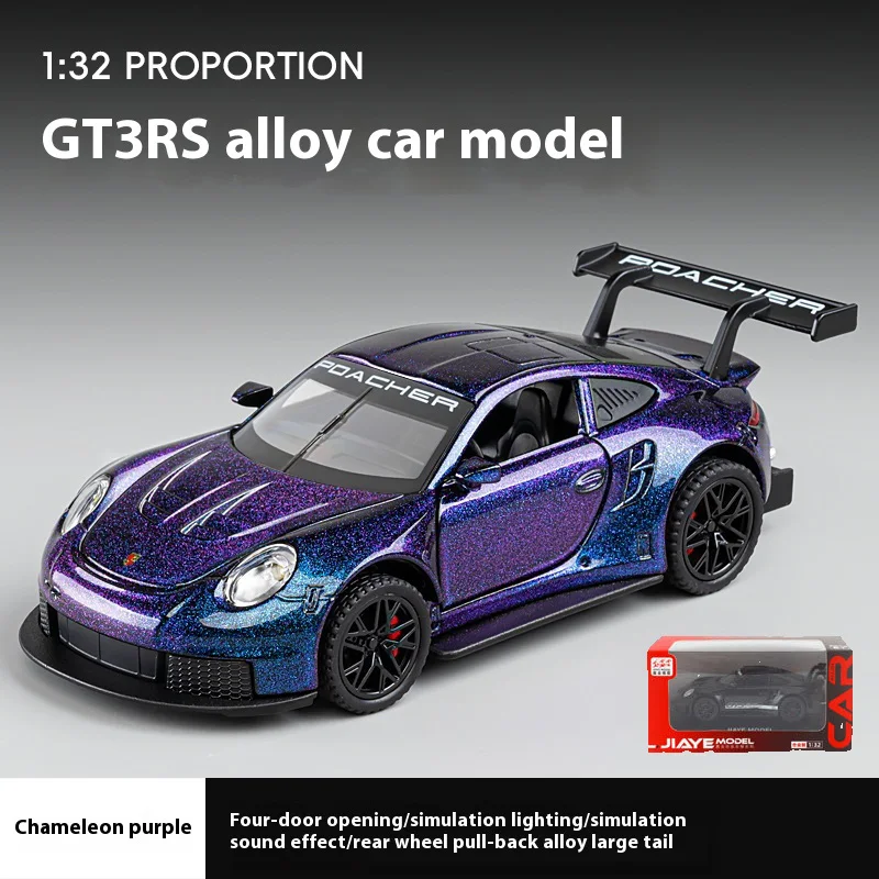 Experience the thrill of a high-performance Porsche GT3 RS with this 1:32 scale diecast model, crafted from sturdy metal for realistic durability. Featuring vibrant color options such as bright blue, black, or purple, it boasts detailed design elements like oval headlights, black decals, side skirts with “GTS RS” decals, multi-spoke black alloy wheels with red brake calipers, and a prominent rear spoiler. Equipped with sound and light functions operated by button batteries, this collectible makes an eye-catching display ornament or special festival gift. Its sleek aerodynamic shape and precise detailing capture the essence of the original sports car, creating a captivating addition to any collector’s showcase.