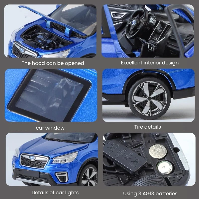- Crafted from alloy and plastic, this 1:32 scale Subaru Forester captures detailed exterior features with a glossy blue finish. It’s designed for realistic appearance and durability, perfect for display or collection.