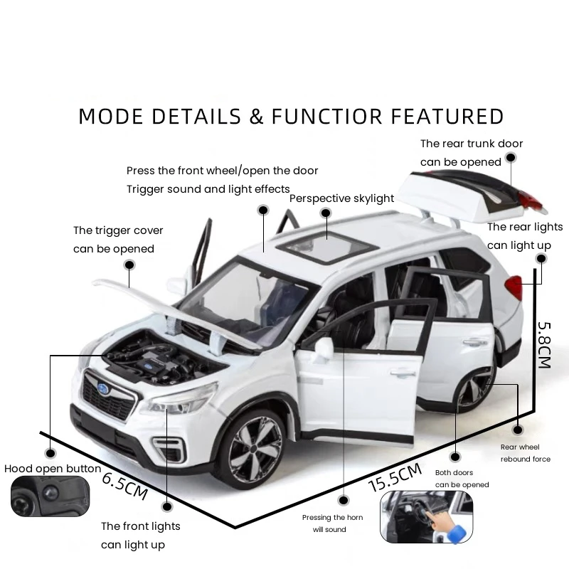 Enhance your display or gift an enthusiast with this detailed miniature Subaru Forester SUV. Its realistic design, vibrant colors, and interactive features mean it’s already a conversation starter. Imagine the joy of having a robust, well-crafted model that embodies adventure and craftsmanship—perfect for collectors or anyone passionate about SUVs. Whether on a shelf or as part of a personal collection, this miniature adds charm and authenticity to any space. Don’t miss out on owning this striking representation of a legendary off-road vehicle—order today and bring a piece of Subaru’s adventure home!