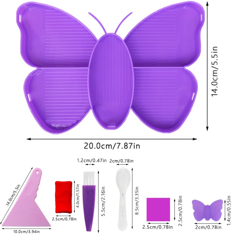 Elevate your crafting projects with this vibrant butterfly-shaped diamond painting tray kit, crafted from durable plastic and available in pink, blue, purple, and white. The tray measures approximately 0–2 cm and features a textured surface with fine grooves for easy placement of square, round, or special-shaped diamonds. The kit includes one butterfly drill tray, five leak stoppers, a spoon, brush, large sorting tray, cleaning brush, correction tool, four drill pens with non-slip sleeves, and six units of glue clay with a storage box, making it ideal for diamond painting, nail art, and beading. Its cheerful butterfly motif and assorted tools inspire creativity and precision in your artistic endeavors.