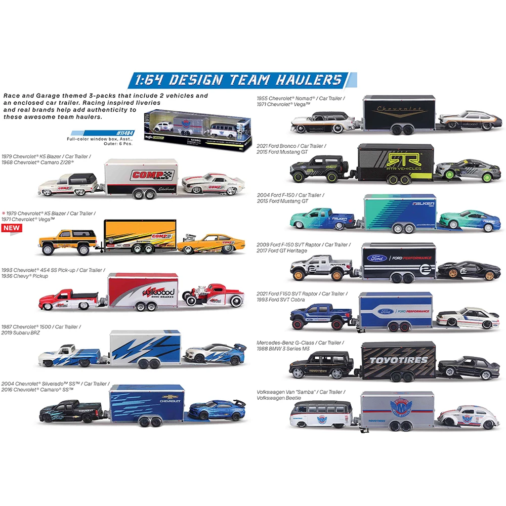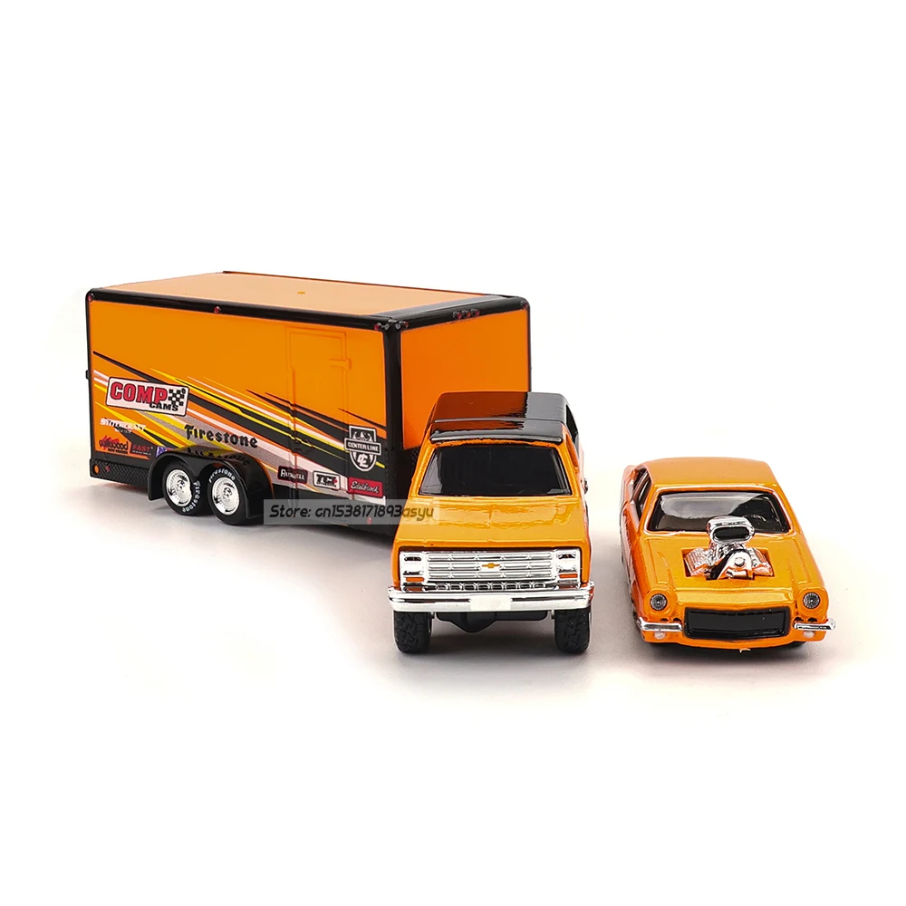 Experience the thrill of owning a highly detailed diecast set that captures the iconic look of vintage Chevrolet vehicles. Measuring approximately 29 cm long, 5.9 cm wide, and 7.4 cm tall, this collection includes a striking orange Chevrolet K5 Blazer with rugged, boxy styling, black roof accents, precise grille, and headlights. Alongside, you'll find a sleek Chevrolet Vega from 1971, featuring smooth curves, a sloped roof, and realistic decals. The textured black cargo trailer with racing graphics, “Comp Cams” and “Firestone,” adds visual flair, while rubber tires and detailed rims elevate authenticity. Perfect for display, education, or collection, this set combines durability with eye-catching vintage charm, making every detail a true tribute to classic automotive design.