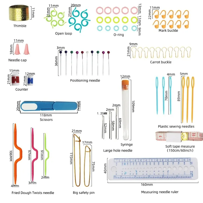 - Complete with assorted plastic stitch markers, a transparent tube, and a rolled-up measuring tape with red markings, making your crafting experience seamless and organized.