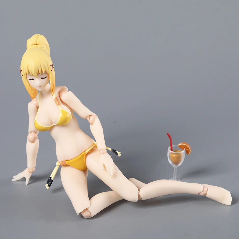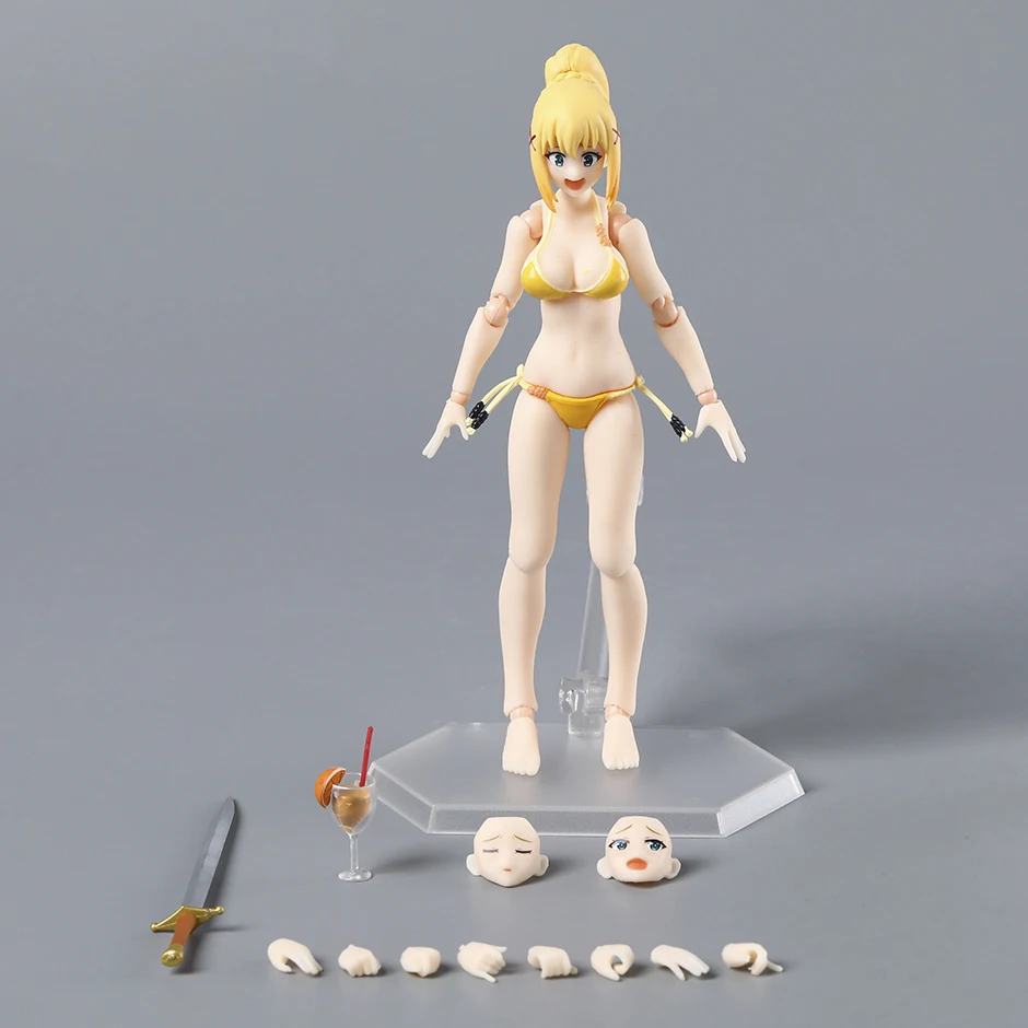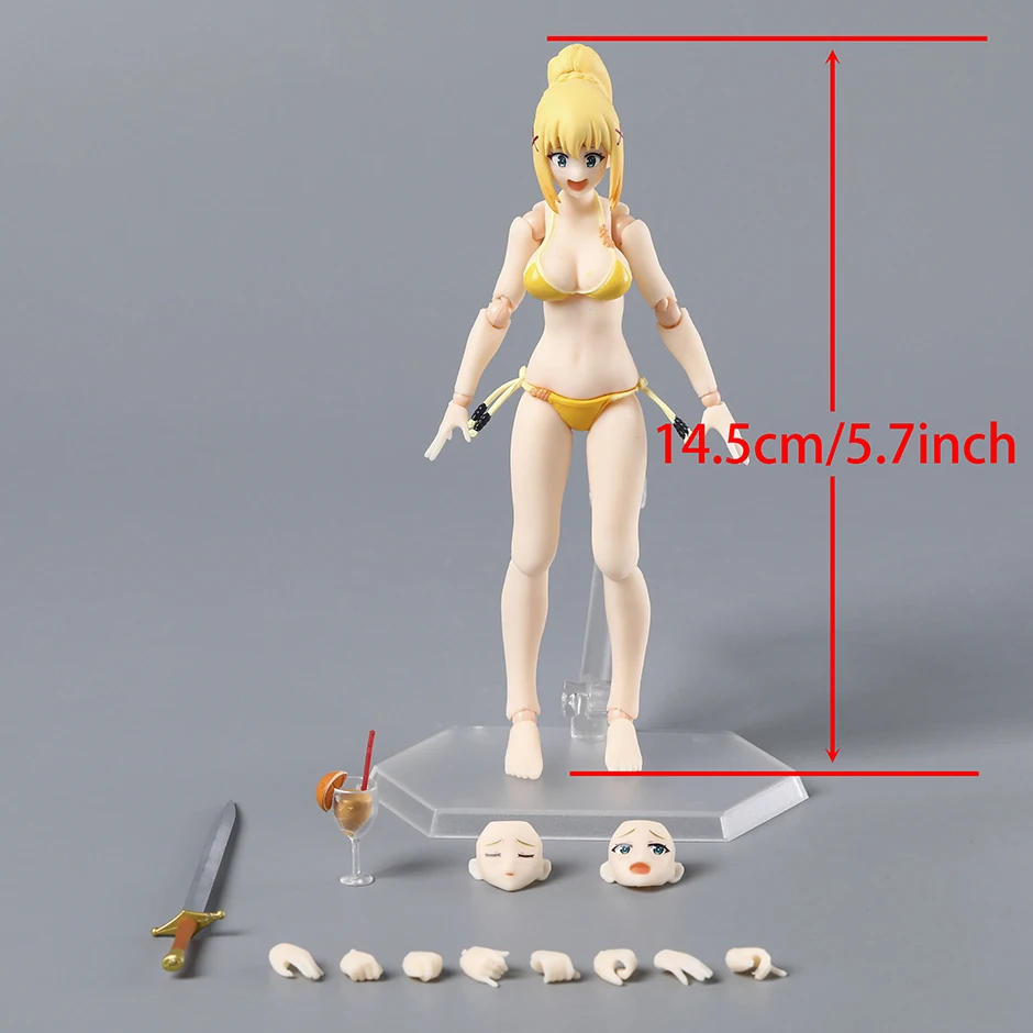 Imagine adding this stunning Darkness action figure to your collection, capturing her playful, bold style in a vivid yellow bikini. Standing approximately 14.5 cm tall, this PVC model exudes charm with her lively pose and expressive features—large blue eyes, a cheerful wide smile, and long blonde hair styled in a high ponytail with framing strands. The figure’s exaggerated, curvy physique is beautifully detailed, emphasizing her playful personality. Her articulation at shoulders, elbows, wrists, hips, knees, and ankles allows dynamic posing, making her perfect for display. The bright yellow bikini, tied with delicate strings and accented with small beads, adds to her bold aesthetic. Whether for display or as a gift, this figure brings character and fun to any space.
