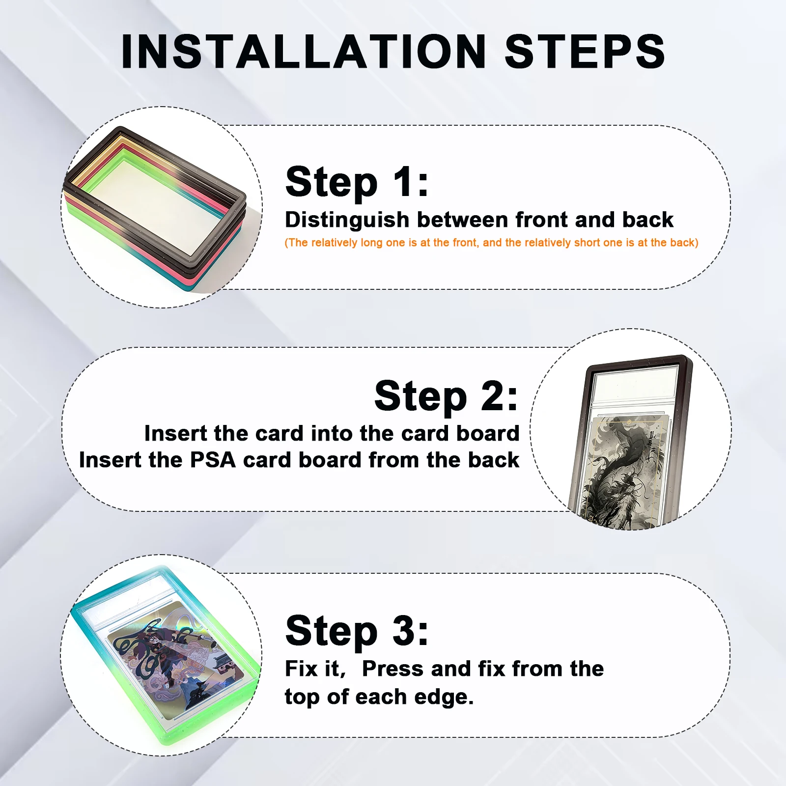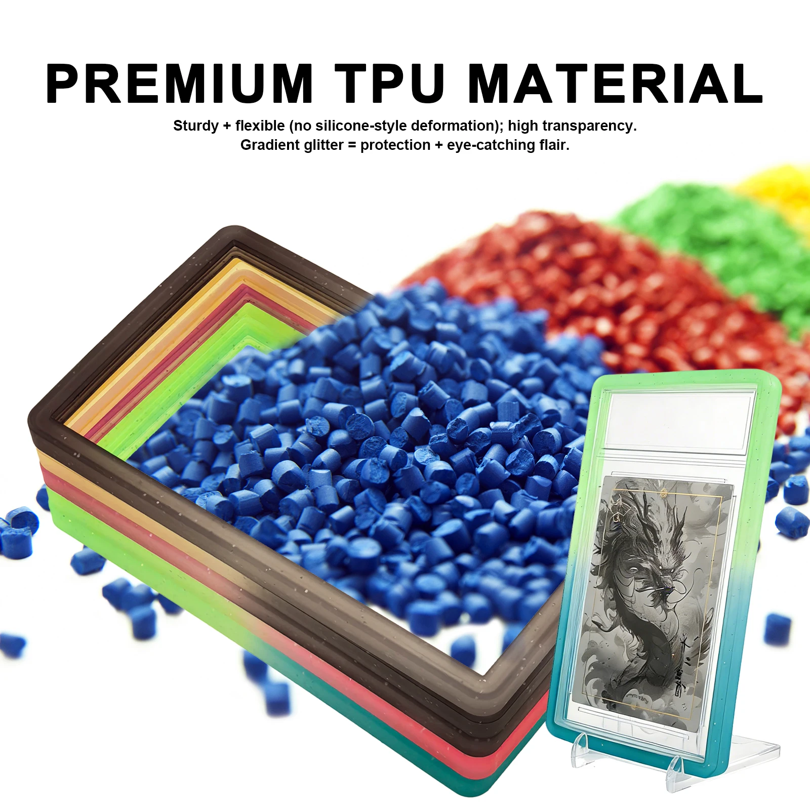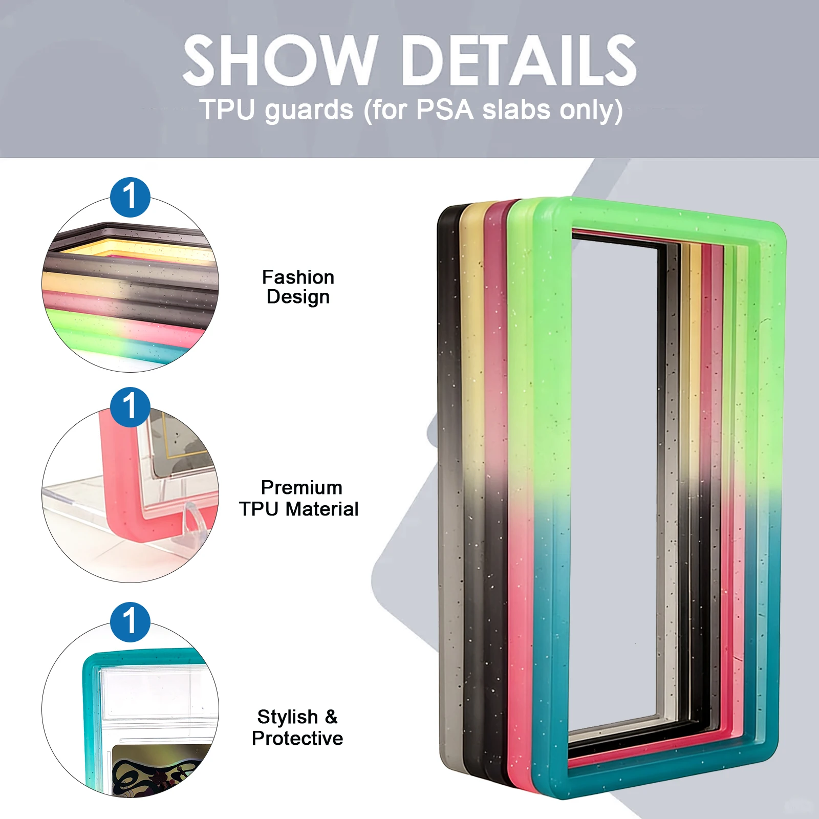 Protect and showcase your PSA 35PT graded card slabs with these 2-gradient silicone TPU bumper cases, designed for durability and style. Available in vibrant color combinations like Blue-Purple, Cyan-Black, Green-Blue, Pink-Green, and more, each case features a soft, flexible, semi-transparent material with rounded edges and a slightly raised lip to safeguard your slabs from impacts and scratches. The cases have a sleek, modern aesthetic with subtle speckled accents along the edges and an open front and back for easy insertion and removal. Designed specifically for PSA 35PT slabs, these cases are ideal for display and protection, offering a colorful and secure fit for your prized collectibles.