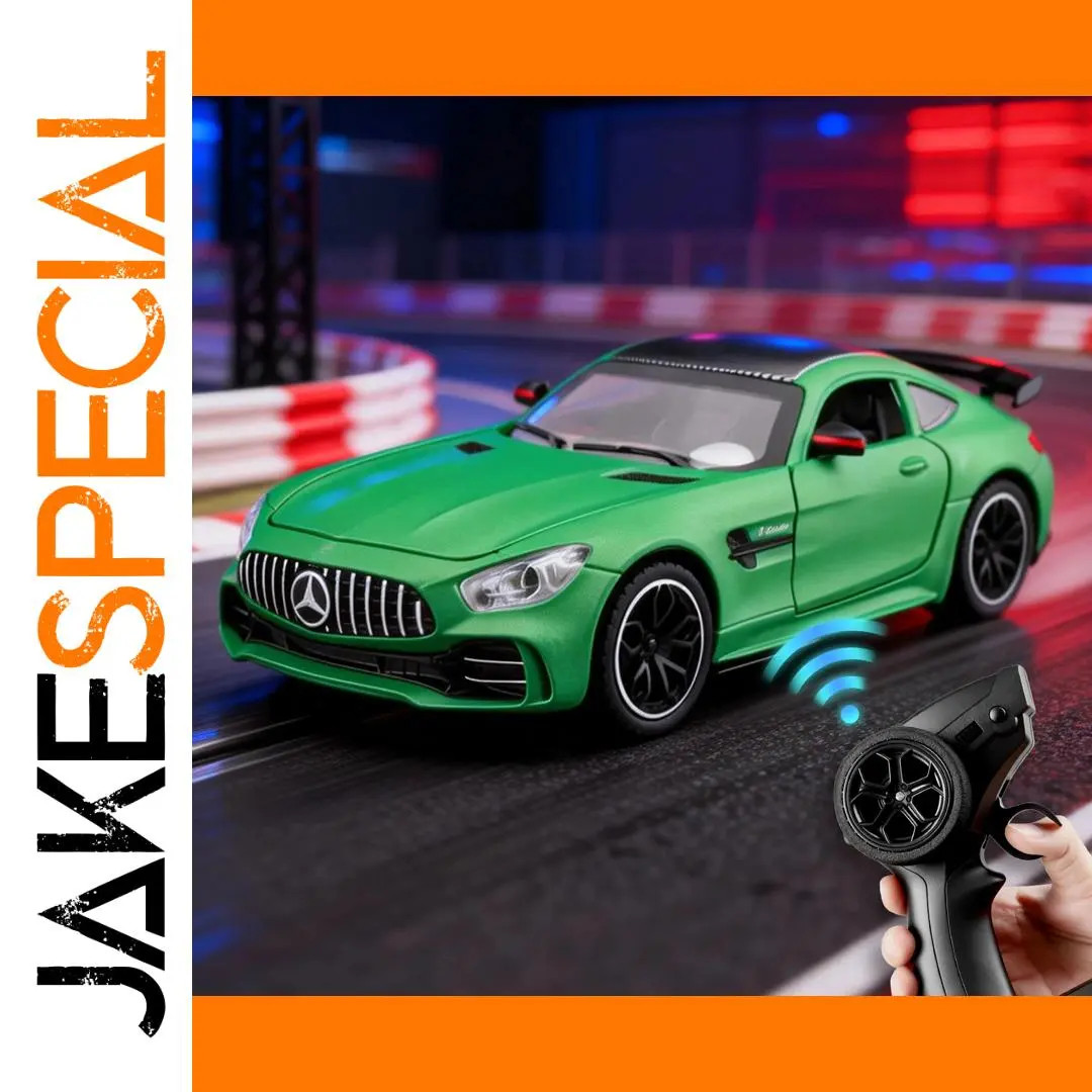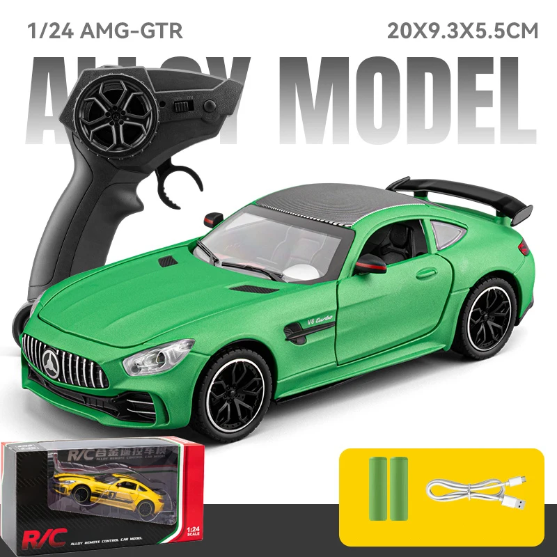 Experience the thrill of high-performance racing with this 1:24 scale GTR RC sports car die-cast model, crafted from durable alloy metal. Featuring a sleek aerodynamic body finished in vibrant green matte, it showcases detailed design elements like a prominent black rear wing spoiler, sculpted door lines, and a distinctive grille with vertical chrome slats. The black alloy-style wheels with silver accents and low-profile tires enhance its sporty stance. Equipped with a remote control powered by included batteries, this model is perfect for display, collection, or gifting to enthusiasts, blending realism, durability, and excitement in a stunning, detailed miniature.