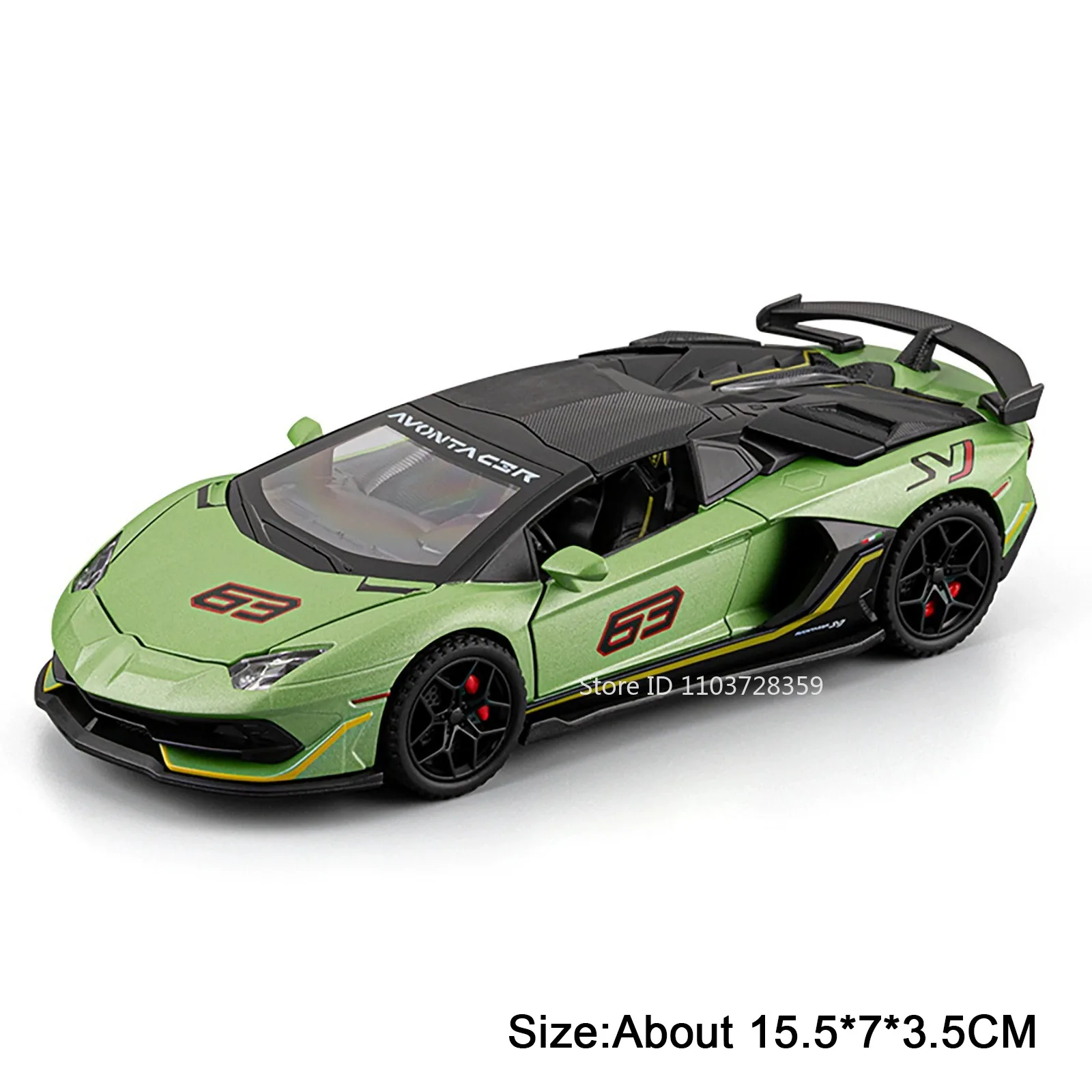 Experience the thrill of owning this meticulously crafted 1:32 scale supercar model, finished in striking matte green that captures attention immediately. Its aerodynamic design, with sharply angled lines and a sleek, open-top body, mirrors the dynamic styling of high-performance sports cars. The black accents and subtle red detailing—a nod to racing heritage—add to its realism. This detailed model includes gullwing doors, a transparent windshield revealing an intricate interior, and a clear plastic roof panel mimicking glass. The rear wing spoiler enhances its sporty look, while the rubber tires and multi-spoke wheels provide a lifelike appearance. Perfect for collectors and enthusiasts alike, this model combines aesthetics with durability for an immersive display or play experience.