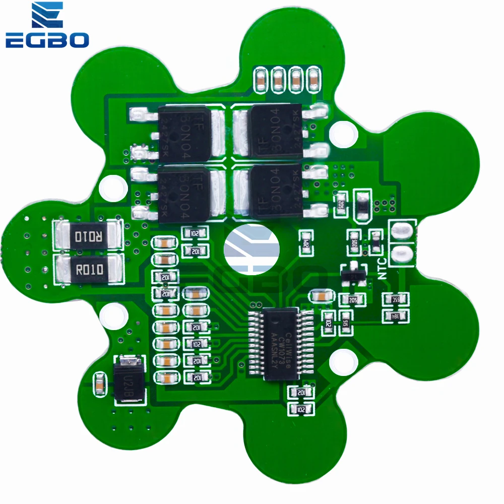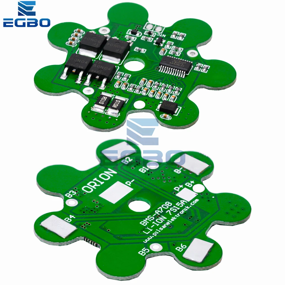 Enhance your 24V solar street LED lighting system with this 7S 15A Lithium-ion BMS PCM module, featuring a vibrant green PCB with a flower-like shape and multiple rounded extensions. Equipped with black integrated circuits, white surface-mount resistors and capacitors, and clearly labeled resistors like R010, it ensures efficient battery management and balance. Designed for a system supply of 25.9V, it operates within a 0-120°C temperature range and offers a dissipation power of 0. This new, customized module guarantees reliable performance and seamless integration for your solar lighting setup, providing you with peace of mind and optimal battery health.