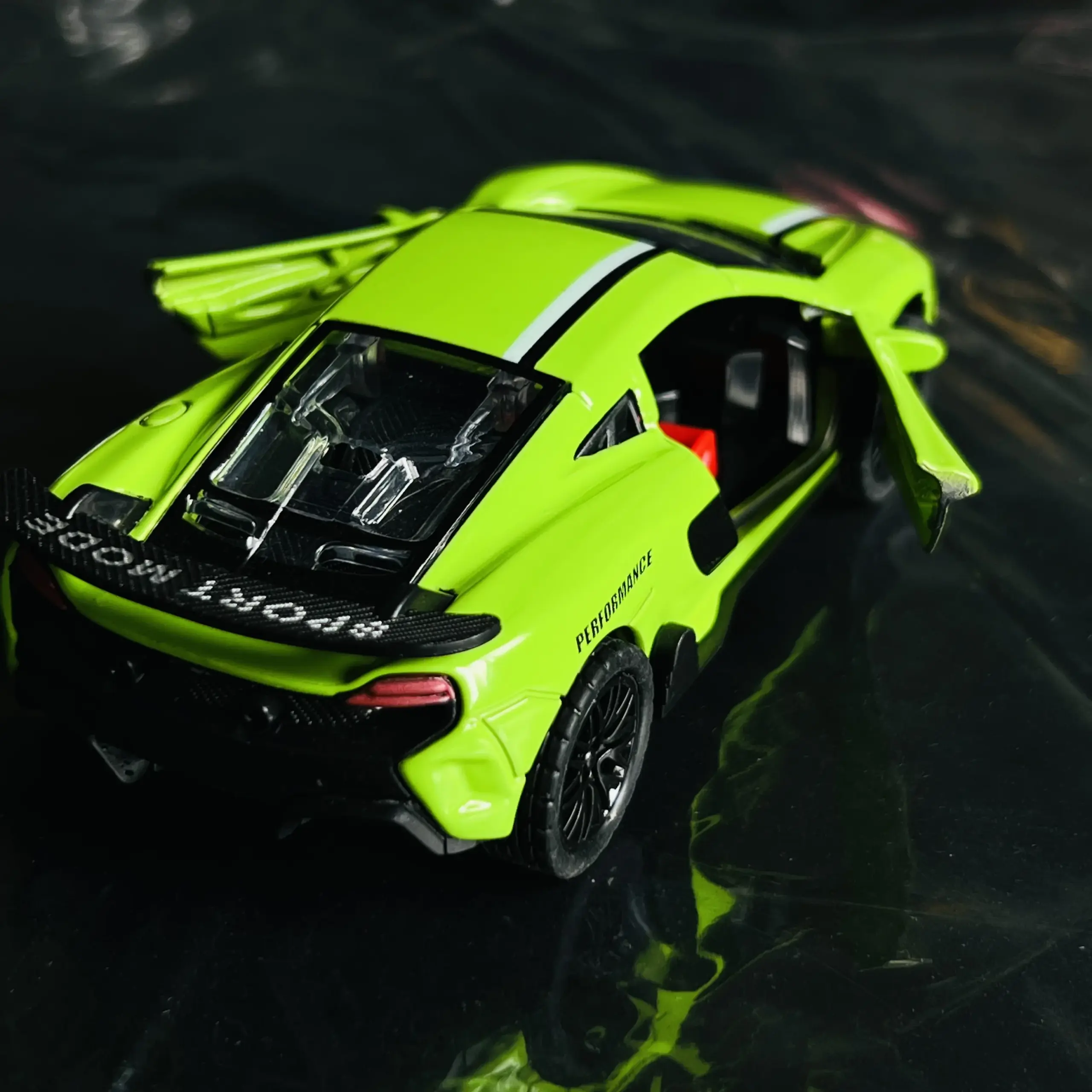 Imagine adding a sporty touch to your collection or sparking joy in a child's playroom with this stunning alloy car model. Featuring a vibrant green finish with bold black and white racing stripes, this miniature sports car exudes energy and speed. Its sleek, aerodynamic design, with smooth curves and sharp lines, mirrors real racing vehicles, making it both a captivating display piece and a functional toy. The detailed front includes clear plastic headlights, a black grille, and an aggressive bumper, while the interior boasts striking red seats visible through a transparent windshield. With black wheels, intricate rims, and a rear spoiler, this model offers a perfect balance of realism and craftsmanship. Feel confident knowing you have a high-quality alloy construction that’s built to impress and last.