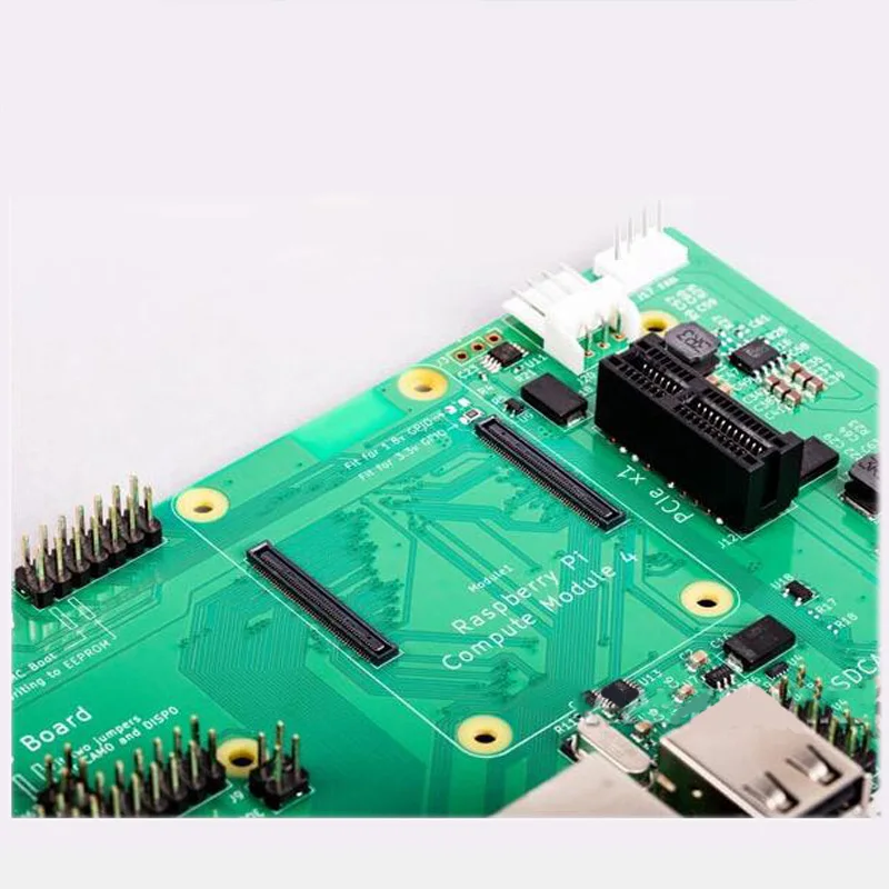 Immerse yourself in the sleek, modern design of this vibrant green Compute Module 4 IO Board. Crafted with a matte finish, its smooth rectangular shape with rounded corners offers a contemporary look that seamlessly integrates into your custom projects. Its organized layout of ports and connectors conveys a professional aesthetic while ensuring easy access and usability. The metallic shielding on USB and Ethernet ports adds subtle contrast, highlighting the technical precision of the design. The black connectors and small surface-mounted components provide visual variation, emphasizing both style and function. Whether you're developing prototypes or embedding this board into a system, this visually appealing yet highly functional design inspires confidence in your technical craftsmanship.