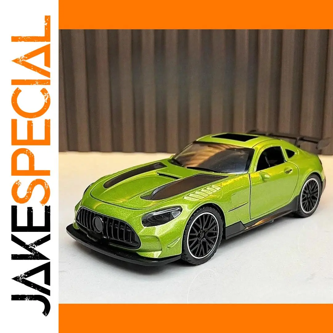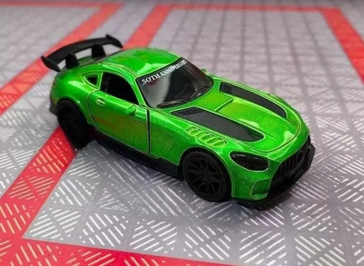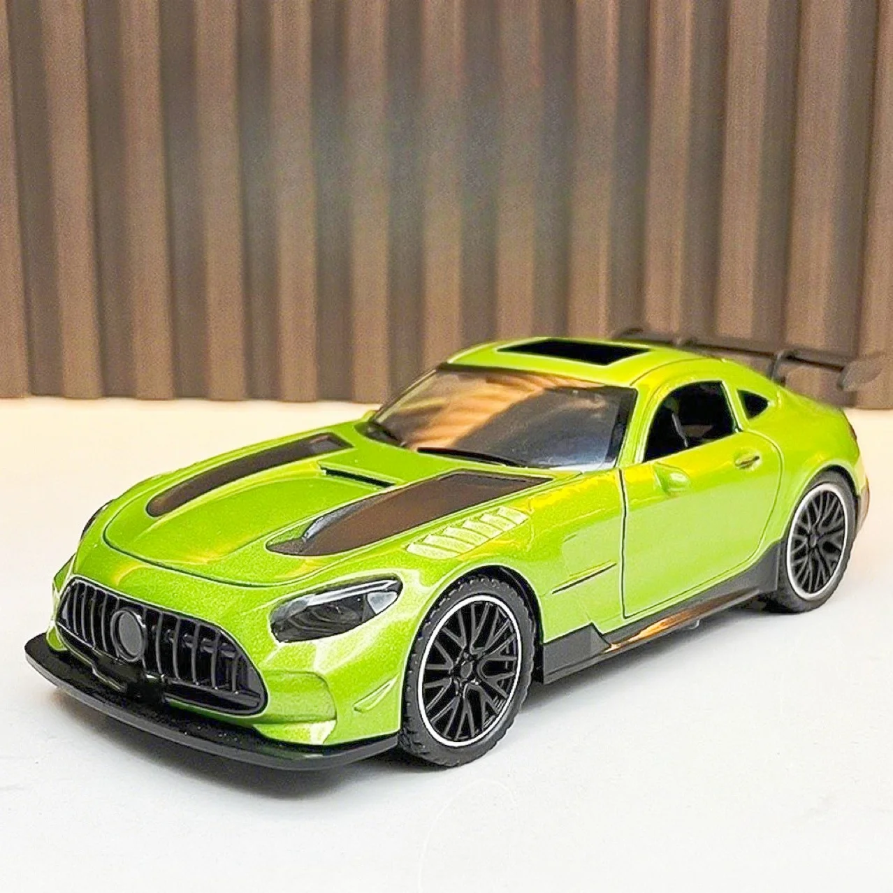 Step into the thrill of high-speed racing with this realistic green diecast racing car toy. Crafted from durable metal, it offers a sleek, aerodynamic design that captures the essence of a sports car. The glossy bright green exterior is accented by bold black details, including a striking black stripe along the hood, black rims, and a prominent rear spoiler that enhances its sporty appeal. The front features a large black grille with vertical slats and narrow, streamlined headlights that blend seamlessly into the body. Sculpted lines and vents on the hood amplify its aggressive, high-performance look. The dark-tinted windows add a touch of sophistication. Compact and sturdy, this pullback model delivers exceptional realism and speed, making it a perfect choice for both kids and enthusiasts who love racing.