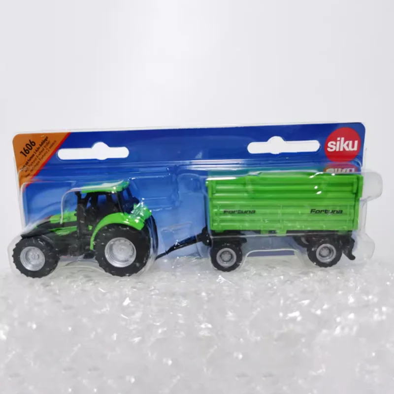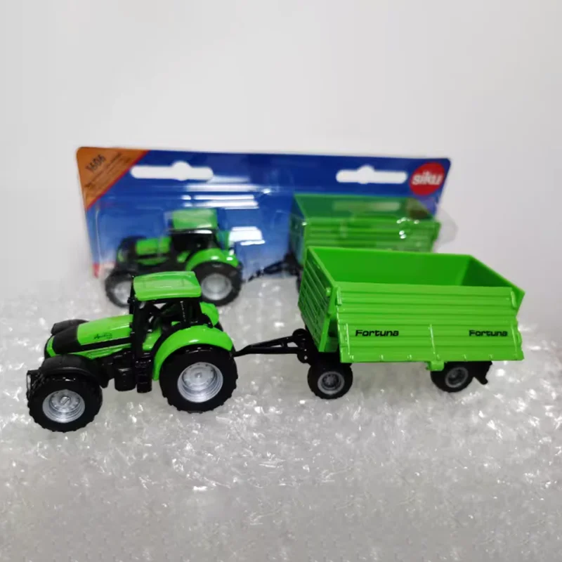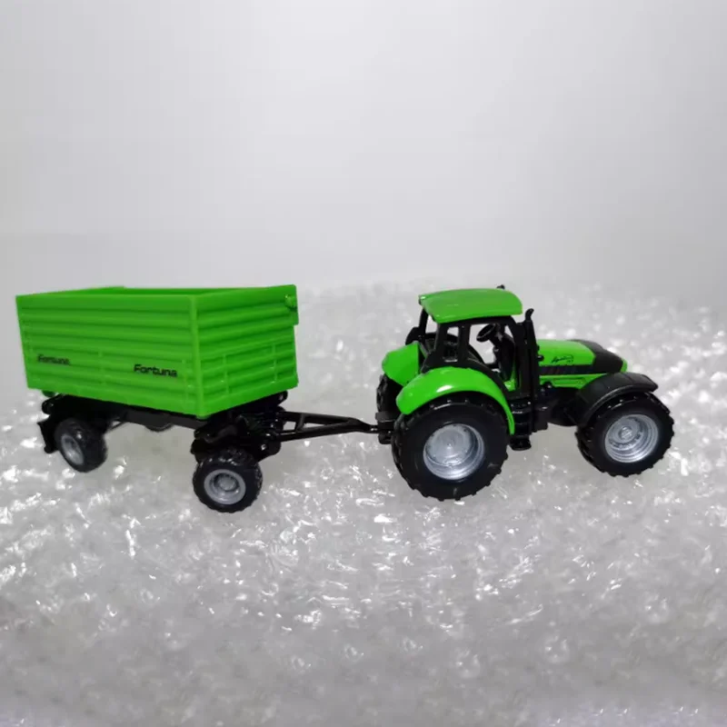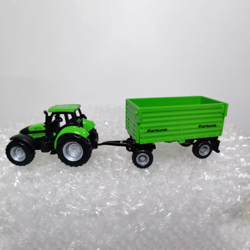 This detailed diecast model features a vibrant green 16 cm tractor with black accents, including wheels and chassis, paired with a matching side-tipping trailer with a ribbed appearance and “Fortuna” branding on its sides. Crafted from alloys and plastics, the static display model showcases a realistic cab with a roof, windows, and an interior steering wheel, emphasizing intricate design and smooth surfaces. Perfect for collectors, gifting, or decorative displays, the model is non-motorized, free from harmful chemicals, and comes in a sealed box, making it an ideal addition for adult enthusiasts who appreciate detailed miniature machinery.