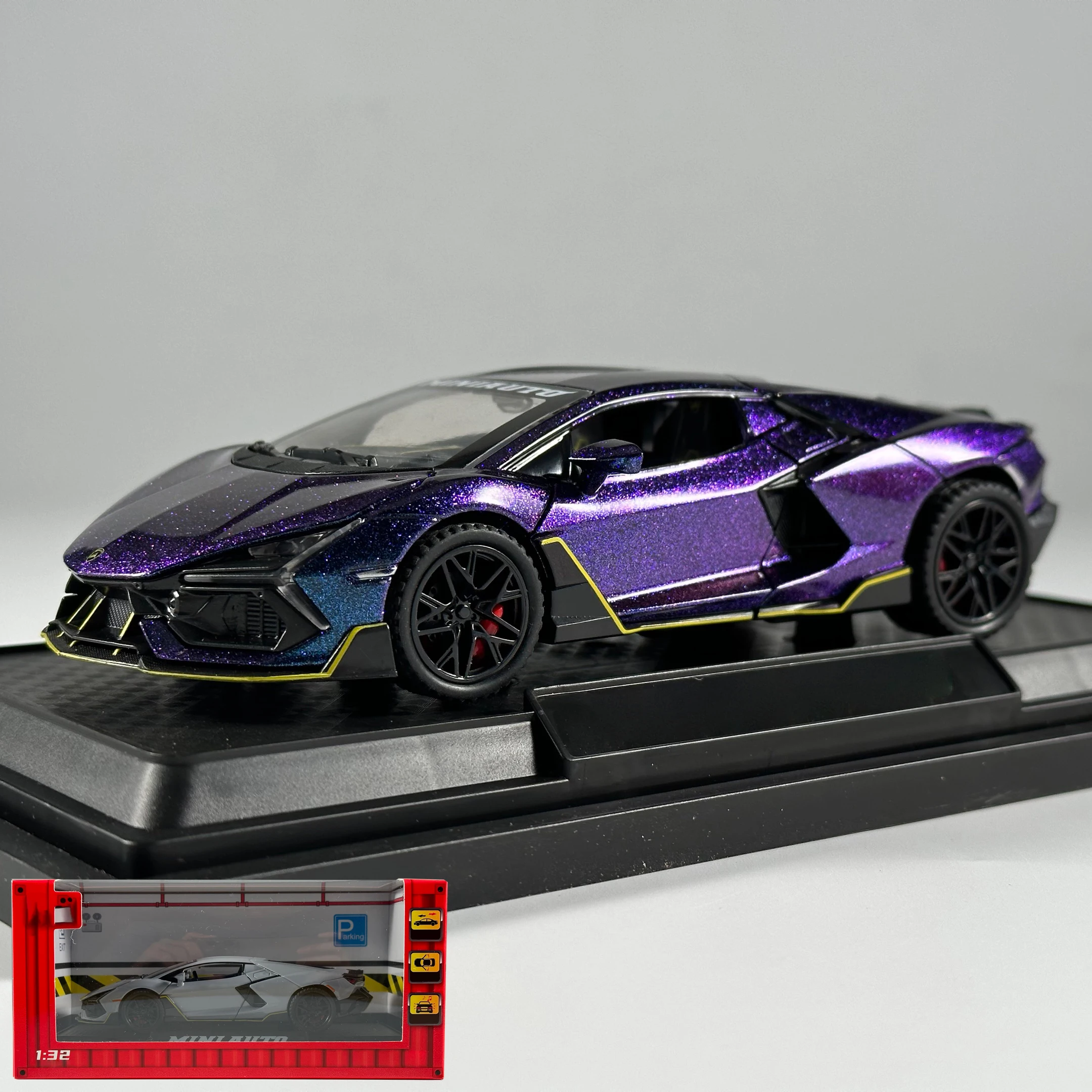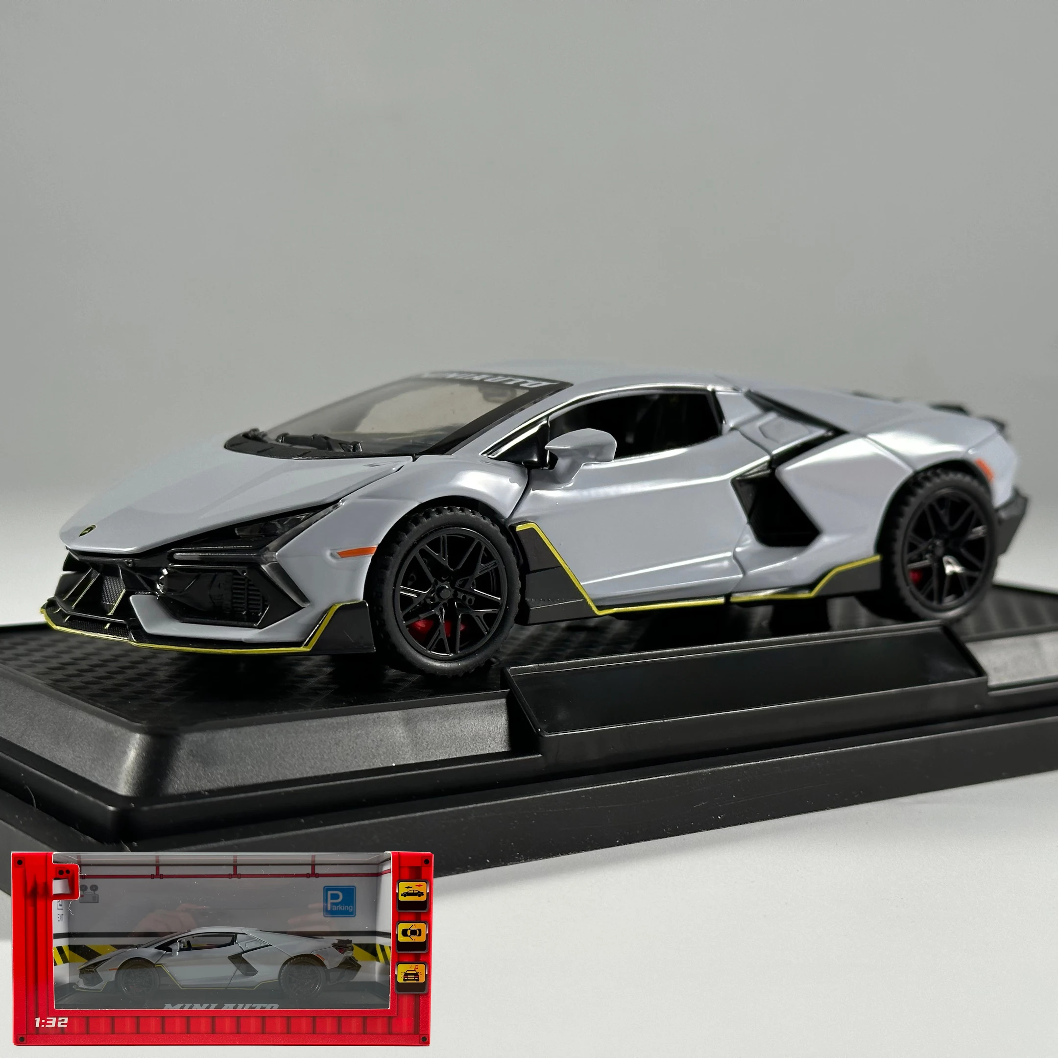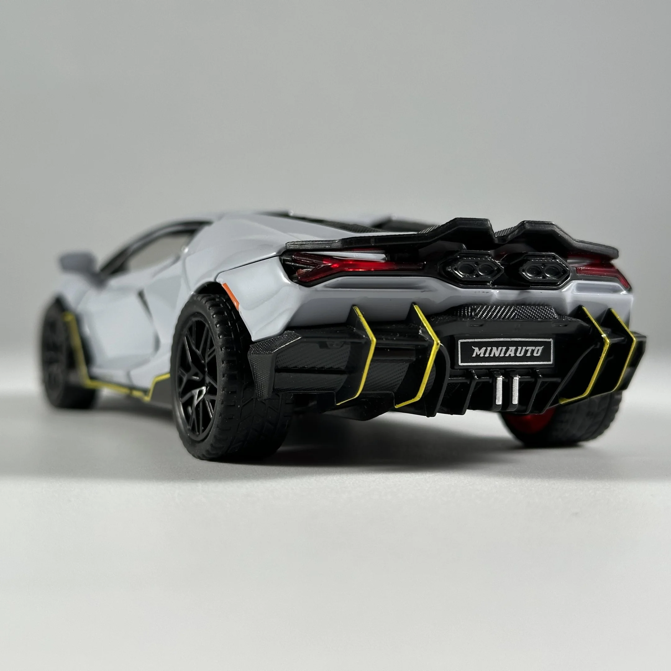 Experience the thrill of owning a highly detailed miniature of the Lamborghini Revuelto supercar. This 1:32 scale diecast model is painted in a striking, glossy lime green, capturing the sleek, aerodynamic silhouette of the actual vehicle. Its smooth, flowing curves combined with sharp, angular lines reflect Lamborghini’s bold design language. The rear features narrow, elongated red taillights, textured black elements on the bumper and diffuser, and centrally positioned metallic exhaust outlets. Aerodynamic vents and intricate details enhance its performance-inspired appearance. The black multi-spoke rims with treaded tires and open gullwing doors add realism and display the sporty interior. This collectible piece is perfect for car enthusiasts, collectors, or as a stunning decorative item on your desk or shelf, capturing luxury and speed in miniature form.